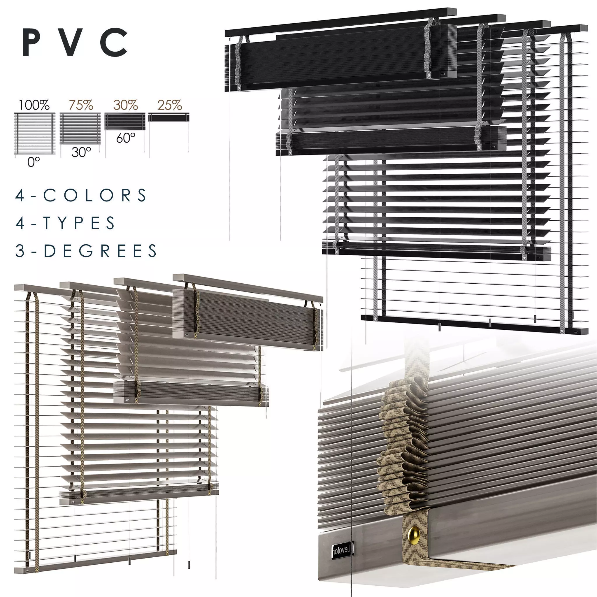 The collection of PVC blinds in:10 configurations, 4 colors, 4 types, 3 degrees.Standard length - 1150 mm - can be easily adjusted to the required size.lamellae width - 45 mmThe width of the fabric tape is 25 mm (in 2 colors).