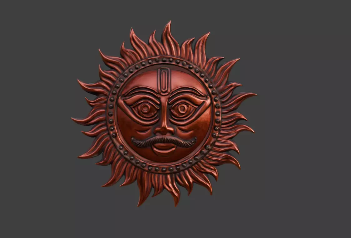 The centerpiece of the design is the expressive solar face, sculpted with distinctive features including large symmetrical eyes, a stylized nose, and a refined mustache. The face evokes the timeless imagery of ancient sun deities often found in cultural artifacts, temple carvings, and ceremonial decorations. The calm yet powerful expression of the face symbolizes illumination, wisdom, cosmic balance, and divine energy.