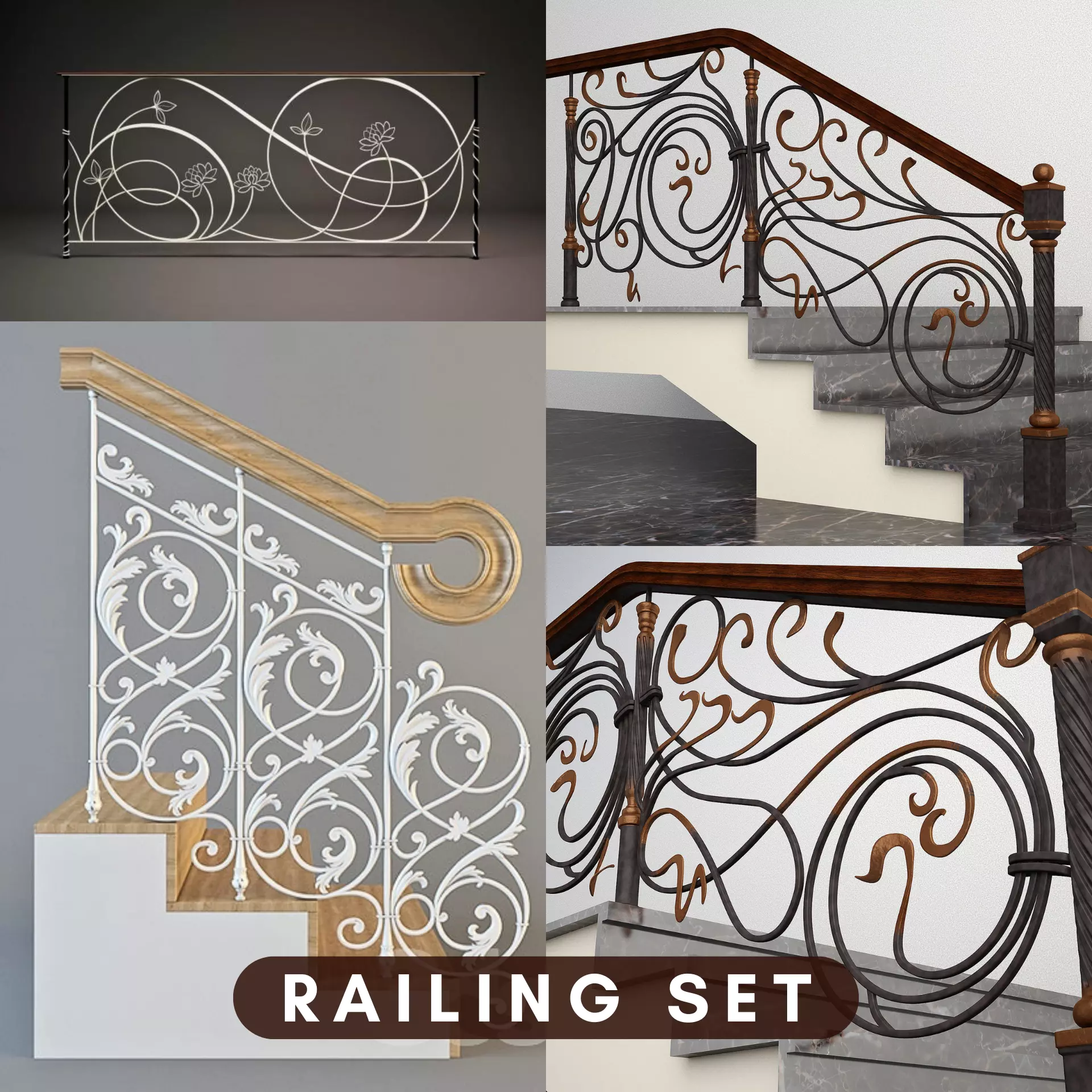 This Railings Set is a high quality, photo real model that will enhance detail and realism to any of your rendering projects. The model has a fully textured, detailed design that allows for close-up renders, and was originally modeled in 3ds Max 2012. Fidelity is optimal up to a 2k render.