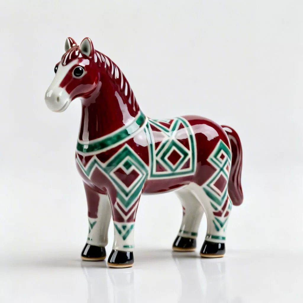 High-Fidelity Pattern Artistry and Hand-Painted DetailA primary feature of this model is the integrated detailed diamond-motif saddle and trim. Every individual line in the green and white geometric arrangements, the delicate white-painted accents on the mane and hooves, and the perfectly smooth transitions between the burgundy and white porcelain sections are modeled with significant surface depth, providing a clear visual indicator of precision craftsmanship and adding incredible tactile detail for close-up inspection.