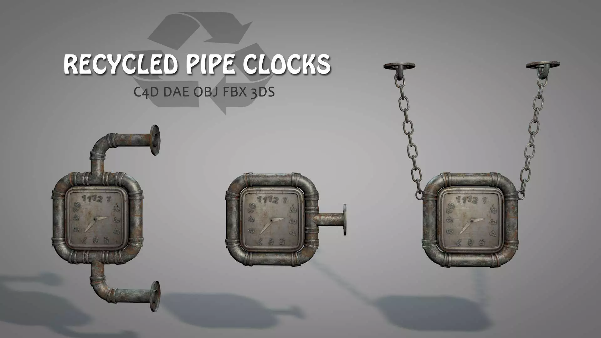 You can use these clock models with my previous furniture sets. They have same materials, same pipes. This model set contains 3 clocks made by recycled pipes. SOURCE C4D file has so many parts in objects (especially in pipes) with good texture images. Other formats have connected objects and baked textures.
