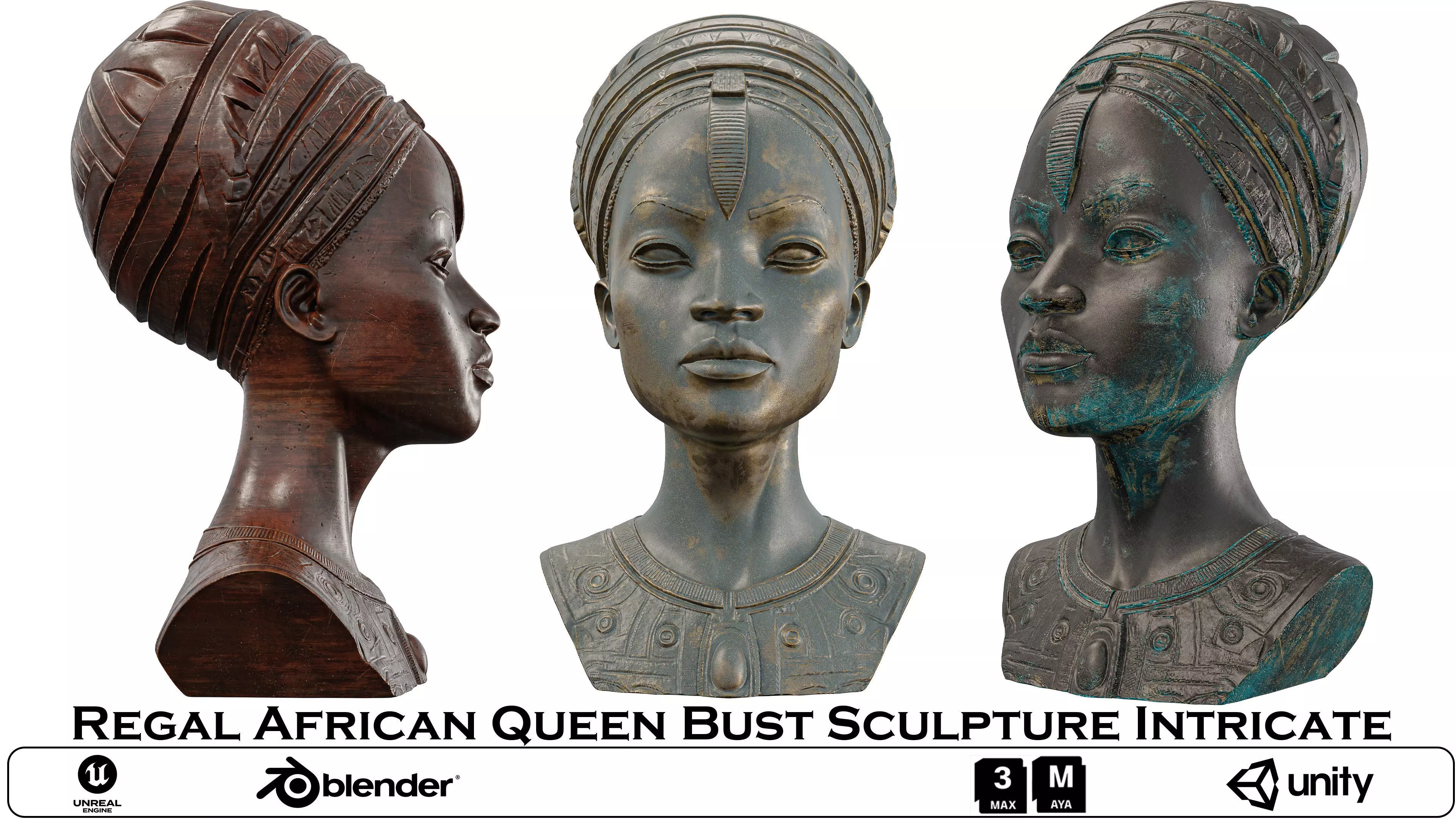 Name: Regal African Queen Bust Sculpture IntricateType: modelFormat: 3Ds Max 2013Export: FBX, OBJRender: VRay (5.x), Corona (9)Polys: 26879Verts: 26840Matclasses: VRayMtl,_CoronaPhysicalMtlUnits: CentimetersDimension: 82.29 x 63.44 x 100.02Date: 2025.9.11