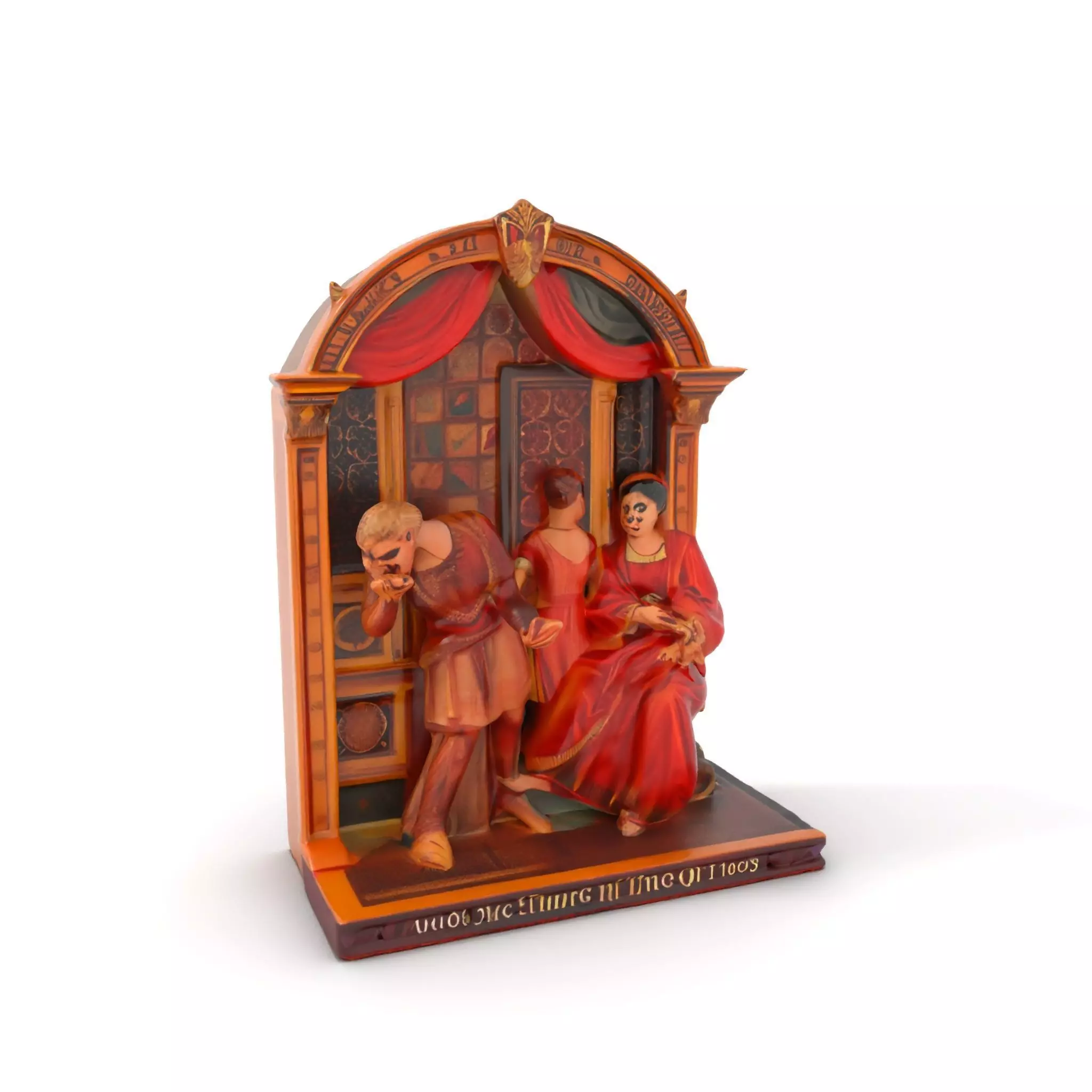 The Renaissance Art Frame model pack is a detailed 3D representation of a classic artwork scene, featuring three figures dressed in historically accurate attire set within a luxurious ornate frame. This model is ideal for historical recreations, art visualization projects, and educational contexts.