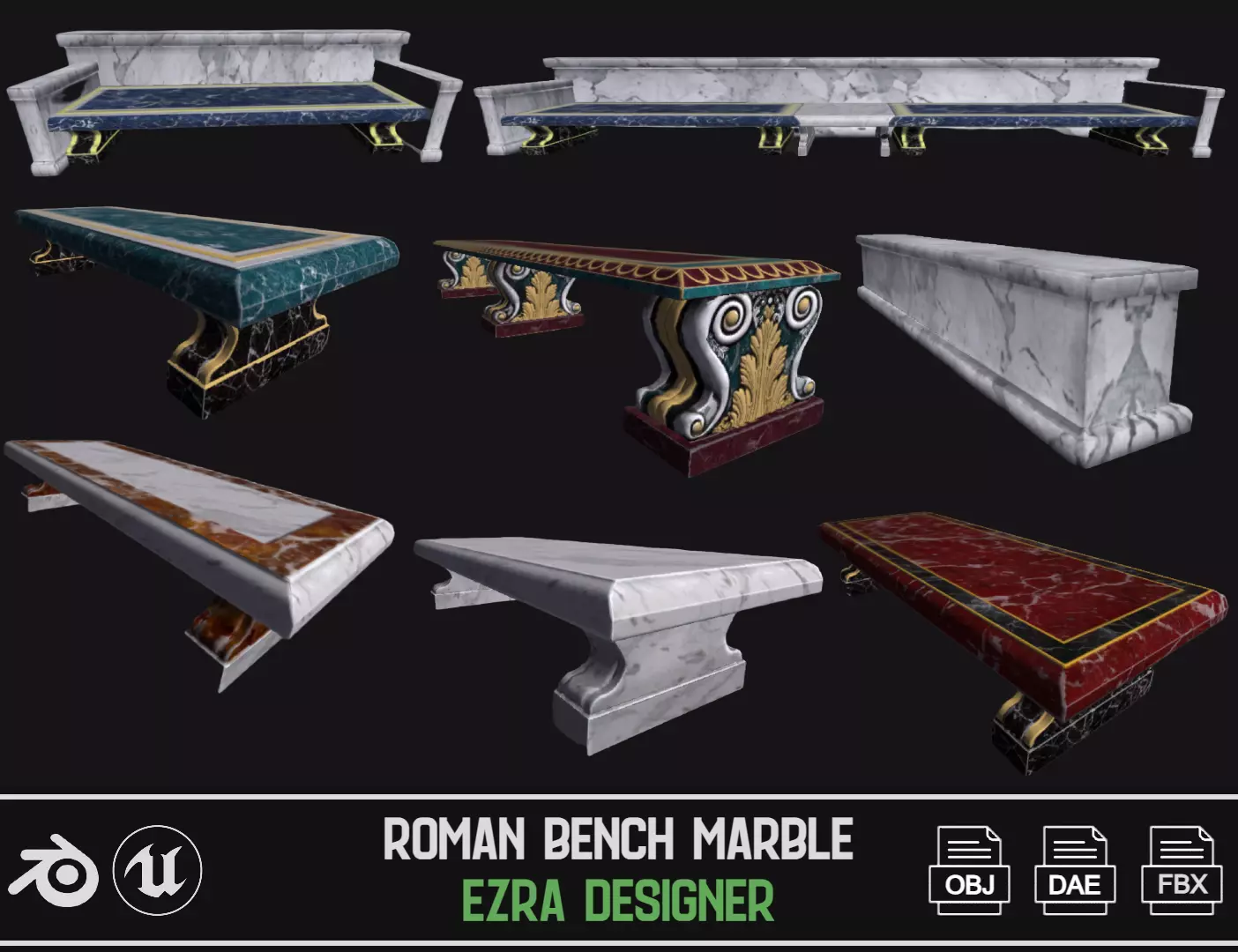 Elevate your 3D scenes with our assortment of 11 meticulously crafted Roman marble benches. Each bench in this collection exudes the grandeur of ancient Rome, featuring intricate marble designs and historical accuracy. Whether you're a history enthusiast, a 3D artist, or simply want to bring a touch of Roman opulence to your digital projects, these 3D Roman marble benches are the perfect choice.