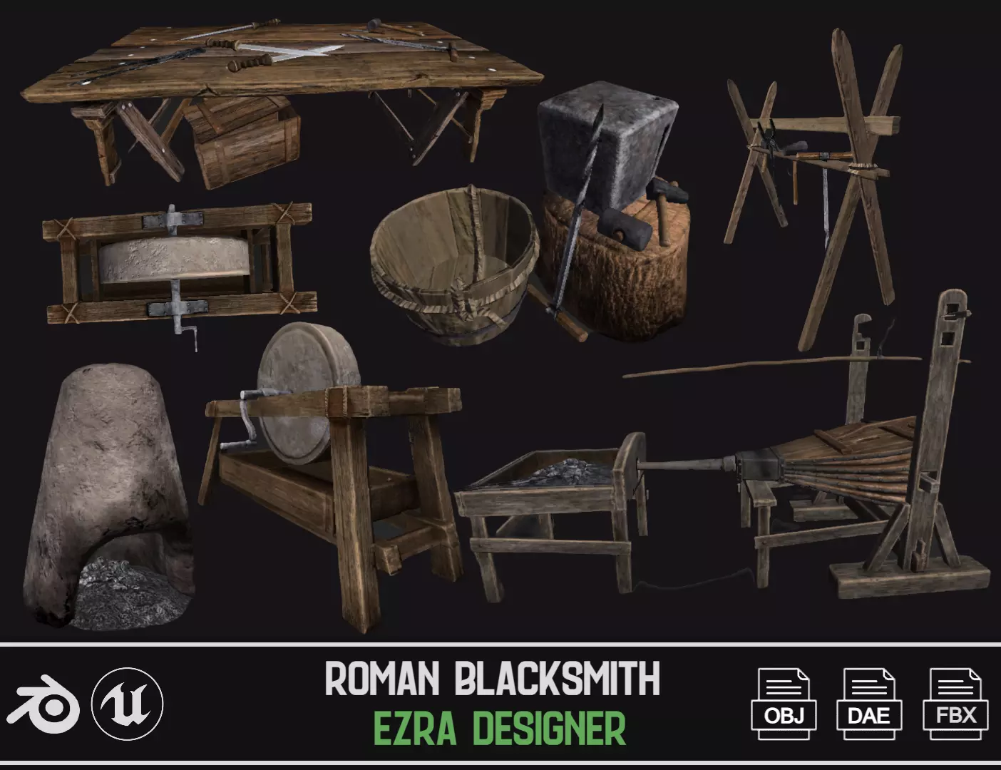 Forge your digital worlds with our diverse collection of 12 Roman blacksmith 3D models. These meticulously crafted models allow you to bring the ancient art of blacksmithing to life in your virtual projects, be it for historical accuracy, game development, or educational purposes. Whether you're a 3D enthusiast, a history buff, or a game designer, this assortment is a must-have for adding realism to your creations.