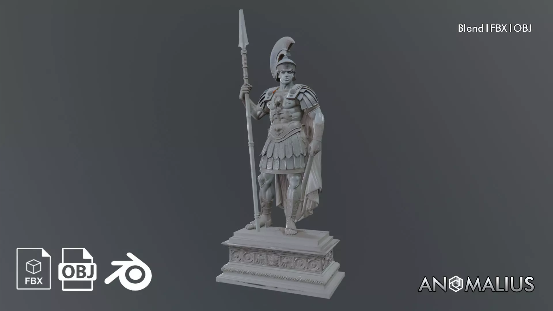 A Roman legionary statue depicting an armored soldier standing guard with a spear, crested helmet, and detailed plate armor on a decorative pedestal. Ideal as a background prop for ancient Roman, historical, or military-themed environments, suitable for games and real-time scenes