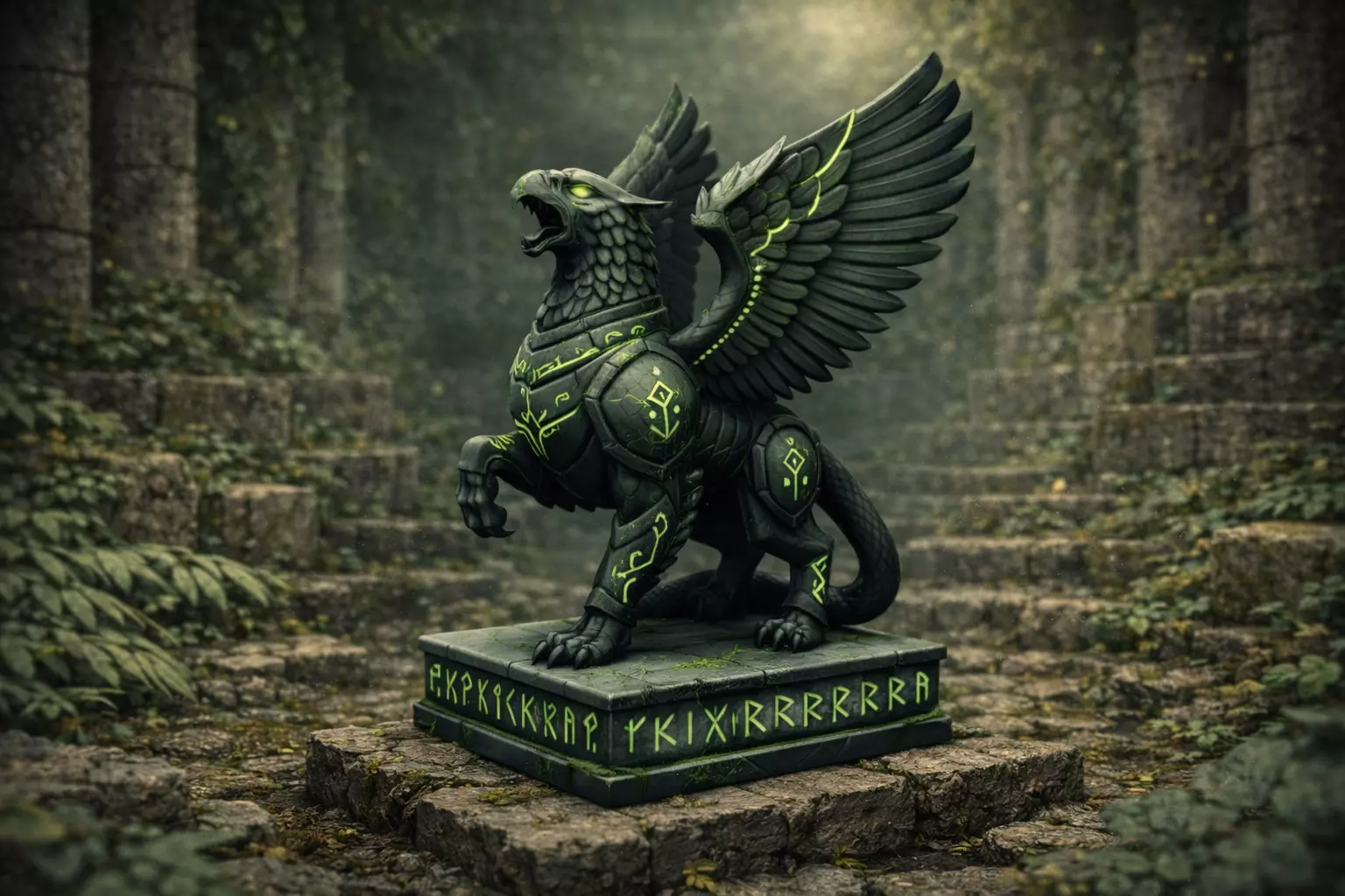 Runic Griffin Guardian – Stylized Fantasy Stone StatueThe Runic Griffin Guardian is a majestic fantasy stone statue combining the power of a lion and the vigilance of an eagle. Sculpted in a stylized yet highly detailed form, this guardian features large spread wings, an aggressive heroic pose, and engraved glowing runes that radiate ancient magical energy.The model showcases a dark stone material enhanced with neon-green runic symbols, giving it a strong mystical and arcane presence. The carved base is also decorated with runic inscriptions, reinforcing its role as a sacred protector or legendary monument.Perfect as a temple guardian, dungeon centerpiece, boss statue, or mythic environment prop, this asset is ideal for fantasy RPGs, strategy games, cinematics, or collectible statue scenes.