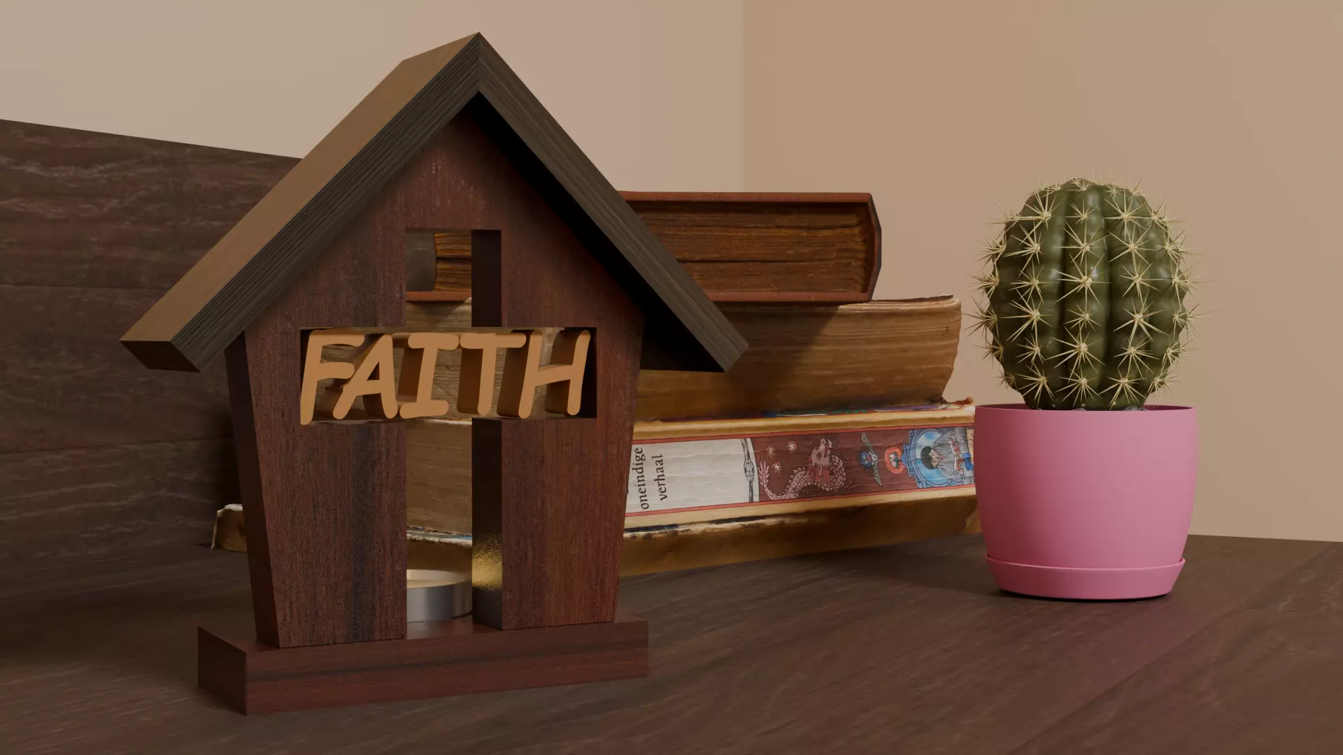 This heartfelt candle holder design features a charming house-shaped wooden display with a pitched roof crafted from layered boards. At the center of the house’s façade, a cross is cleanly cut out, creating a luminous window for light to shine through. Across the horizontal bar of the cross, the word “Faith” is beautifully extruded in raised 3D lettering, adding depth and meaning to the piece. On the back, a small recessed space holds a standard tealight, which softly illuminates the cross and lettering from within. The natural wood finish highlights the craftsmanship and warmth of the material, while the glowing light brings a comforting, spiritual ambiance. This candle holder makes a touching decorative accent—perfect for a mantel, prayer space, or as an inspiring symbol of faith and light.