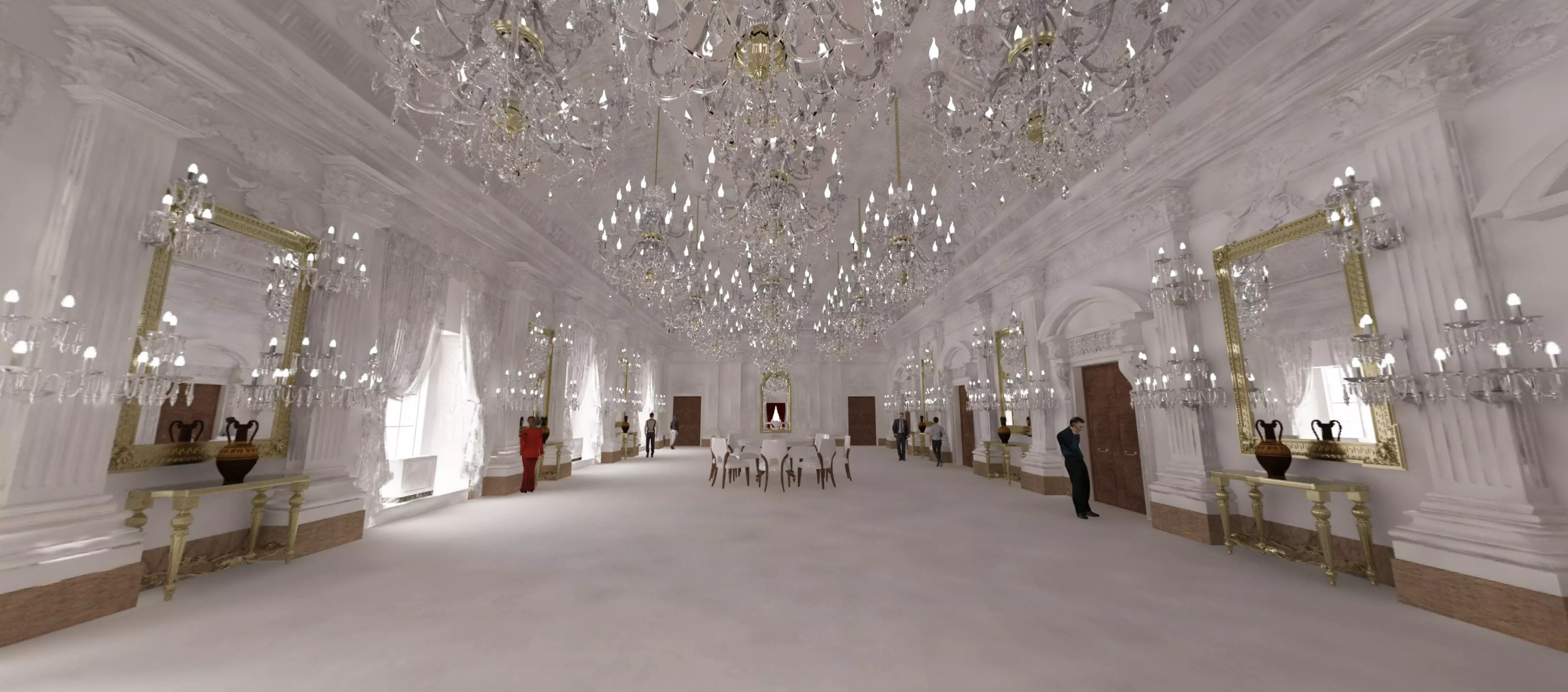 Il cosiddetto Salone dei Forestieri di epoca medicea fu trasformato, su volere del Granduca Pietro Leopoldo, in una sontuosa sala da ballo (ad oggi la più grande dell'intero Palazzo) adorna di stucchi ad alto rilievo realizzati tra il 1774 e il 1776 dai fratelli luganesi Grato e Giocondo Albertolli, cui il Granduca affidò anche la decorazione del salone da ballo della Villa del Poggio Imperiale. La ricchezza ornativa degli stucchi, tutta orientata su simboli e stilemi di matrice neoclassica, dona all’ambiente un carattere di raffinata eleganza accentuata dalla luminosità dei bianchi, che risalta sugli sfondi tinteggiati in colori pastello – rosa, verde, ocra – tornati alla luce, dopo gli ultimo restauri, nelle loro delicate cromie. Le pareti laterali sono scandite in intervalli architettonici da lesene corinzie e da grandi portali, questi ultimi riccamente decorati da cornici culminanti nei sovrapporta (timpani a sesto ribassato) che immettono negli ambienti adiacenti la sala.