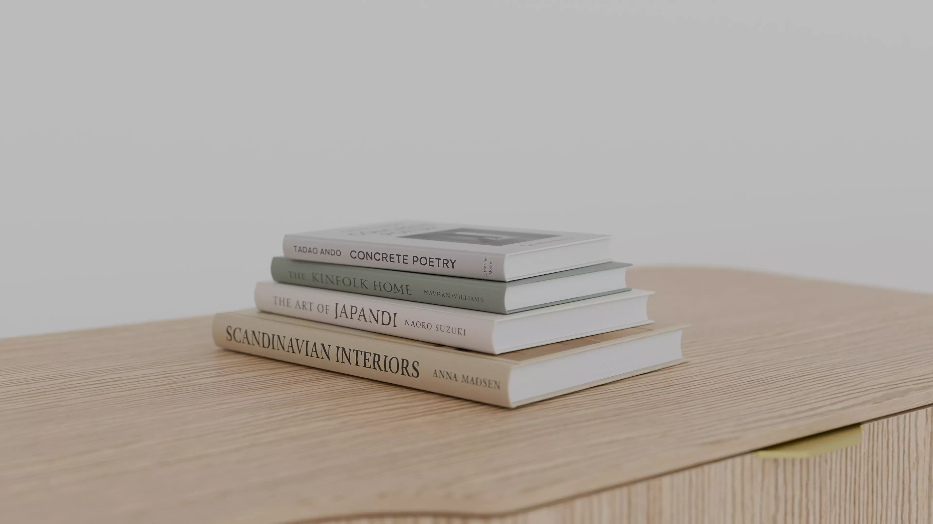 A curated stack of four hardcover books styled to complement modern Scandinavian, Japandi, and minimal interior design aesthetics. Perfect for adding detail to shelves, coffee tables, or staging scenes in architectural visualizations.