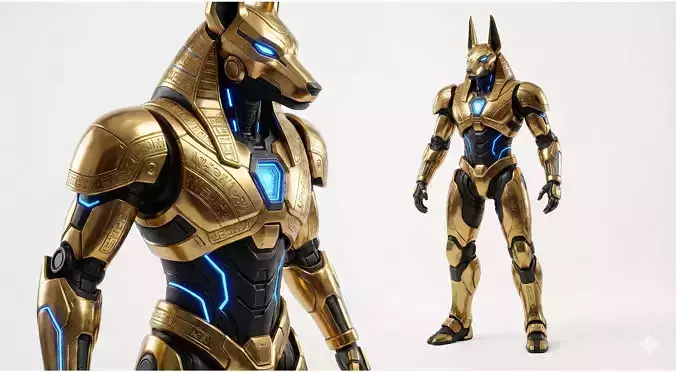 Unique Design: A fusion of classic Pharaonic armor (Gold & Black) with high-tech mechanical joints and emissive neon blue details.