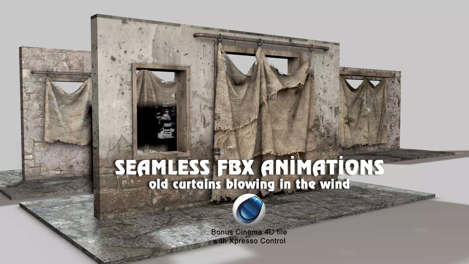 oldcurtains(BAKED).C4D (R19) has non-animation connected objects and baked textures. This format needs both TEX and UVTEX folders for materials.