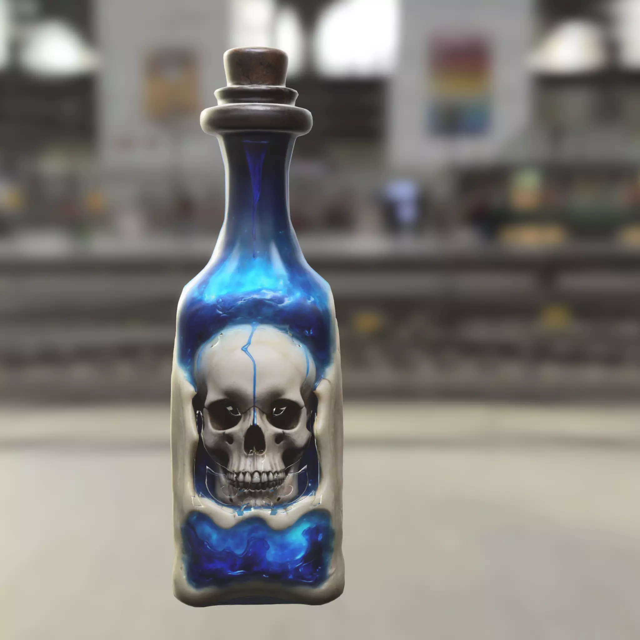 A sinister 3D model of a dark potion bottle featuring a realistic skull embedded in glowing blue liquid. This asset is designed for use in horror, necromancy, or magic-focused games such as Diablo IV, Dark Souls, Elden Ring, The Witcher, or Skyrim. Perfect for inventory systems, alchemy crafting, or environment props. This model is provided in OBJ, FBX, STL, DAE, PLY, and GLB formats, making it fully compatible with engines like Unreal Engine, Unity, and tools like Blender. Also optimized for 3D printing to bring your dark fantasy world into the physical realm.