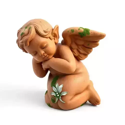 This highly detailed 3D model presents a serene sleeping cherub, crafted in the classic style of a terracotta garden statue. The figure embodies peace and innocence, depicted with closed eyes and delicate wings, subtly weathered with patches of green moss and adorned with a small, elegant white flower on its lower back, suggesting age and natural integration into its surroundings. This versatile asset is perfect for a wide range of creative projects, including enhancing virtual garden scenes, adding a touch of classical charm to architectural visualizations, or serving as a contemplative element in digital art compositions. Its robust design also makes it an excellent candidate for 3D printing, allowing for tangible reproductions. Optimized for both real-time applications such as game development and AR/VR experiences, as well as high-quality static renderings, this model boasts clean, efficient topology and is fully UV unwrapped. It comes complete with PBR textures to ensure a realistic material appearance across various rendering engines. The model supports multiple industry-standard file formats, including GLB, OBJ, STL, ABC, DAE, FBX, USD, and PLY, ensuring broad compatibility and ease of integration into any workflow. Whether you're building an ancient ruin, a peaceful park, or a stylized fantasy environment, this cherub model will add character and depth to your scenes.