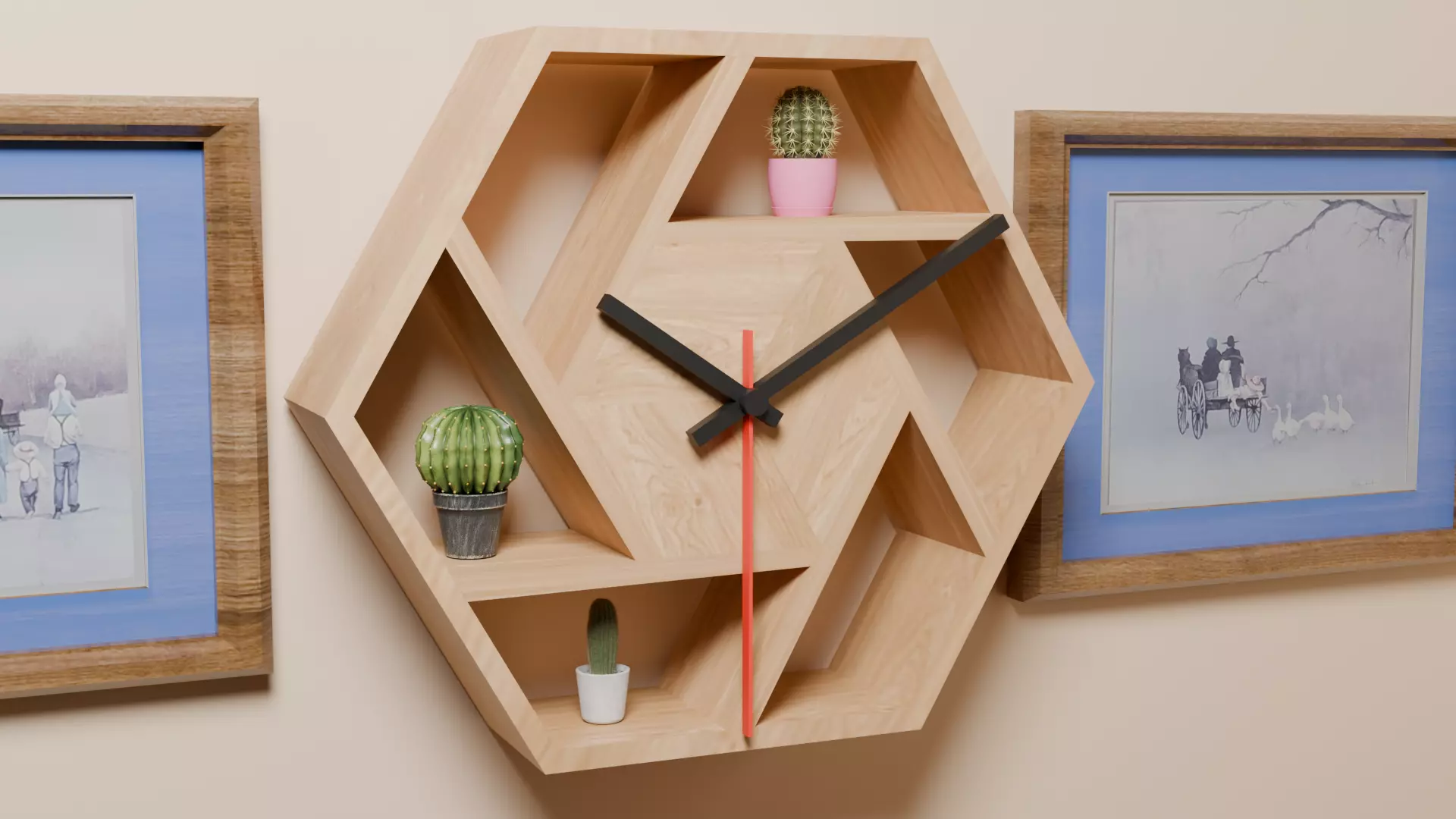 This geometric wall clock doubles as a curio shelf, blending function and design in a unique piece. The outer frame is a hexagon constructed from 1x6 wooden boards, while a smaller hexagon-shaped box sits in the center. From this central box, boards extend along each edge to the midpoint of the outer frame, creating multiple compartments ideal for displaying small items, collectibles, or curios. The clock face is minimalist, with oversized black hands and a striking red second hand, providing a clear, modern timekeeping feature. The combination of natural wood textures, geometric precision, and functional shelving makes this piece both practical and decorative. Perfect for kitchens, living rooms, or offices, it adds visual interest while offering display space. Its layered hexagon design, clean lines, and bold clock hands create a contemporary statement piece that is both artistic and versatile.