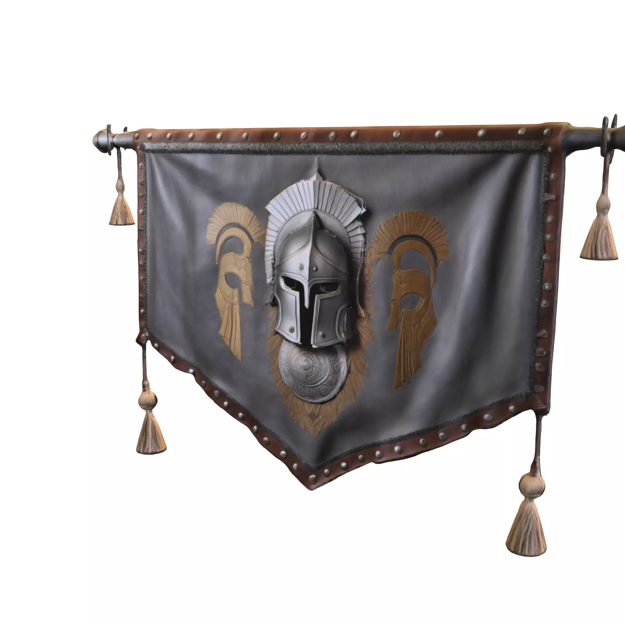 The Spartan Honor Banner is a high-quality 3D model featuring a central Spartan helmet and shield emblem, flanked by golden warrior profiles on a leather-style hanging banner. This asset adds an epic and historical atmosphere to game environments, ideal for ancient temples, war halls, strongholds, or battle arenas.