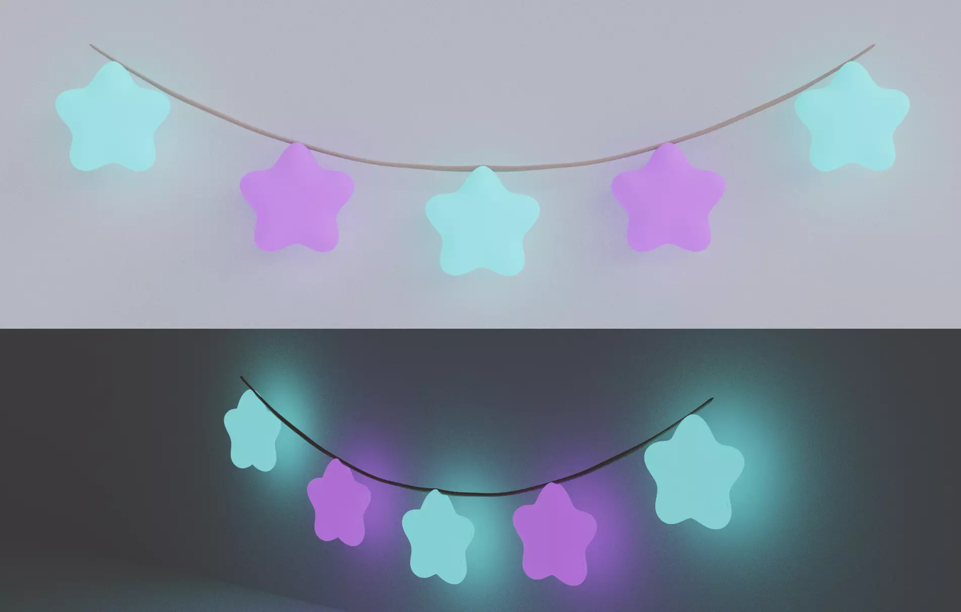 A charming 3D stylized star garland featuring five glowing stars, alternating in soft blue and gentle purple tones. Perfect for cozy interiors, festive decorations, magical scenes, or stylized environments in games and animation.Each star emits a subtle glow, creating a dreamy atmosphere that adds warmth and whimsy to any project. Ideal for holiday visuals, bedroom decor renders, fantasy games, or children's illustrations.