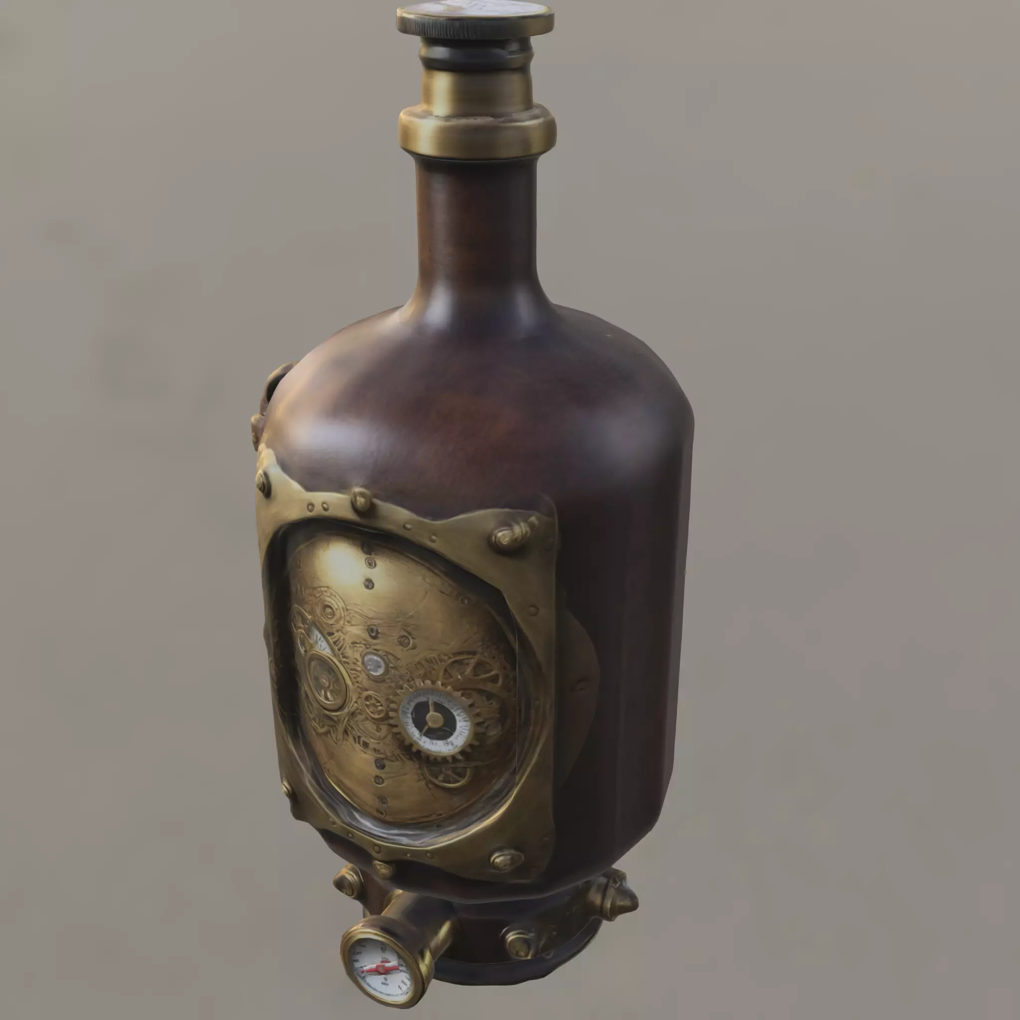 A detailed steampunk-style bottle featuring brass pipes, gears, pressure gauges, and mechanical engravings. This versatile 3D model can be used as a decorative item, quest object, or energy core in games like Fallout, Bioshock, Roblox, VRChat, and The Sims. Ideal for steampunk, sci-fi, or alternate-history themed environments. Also fully optimized for 3D printing to be used in props, dioramas, or tabletop scenarios.