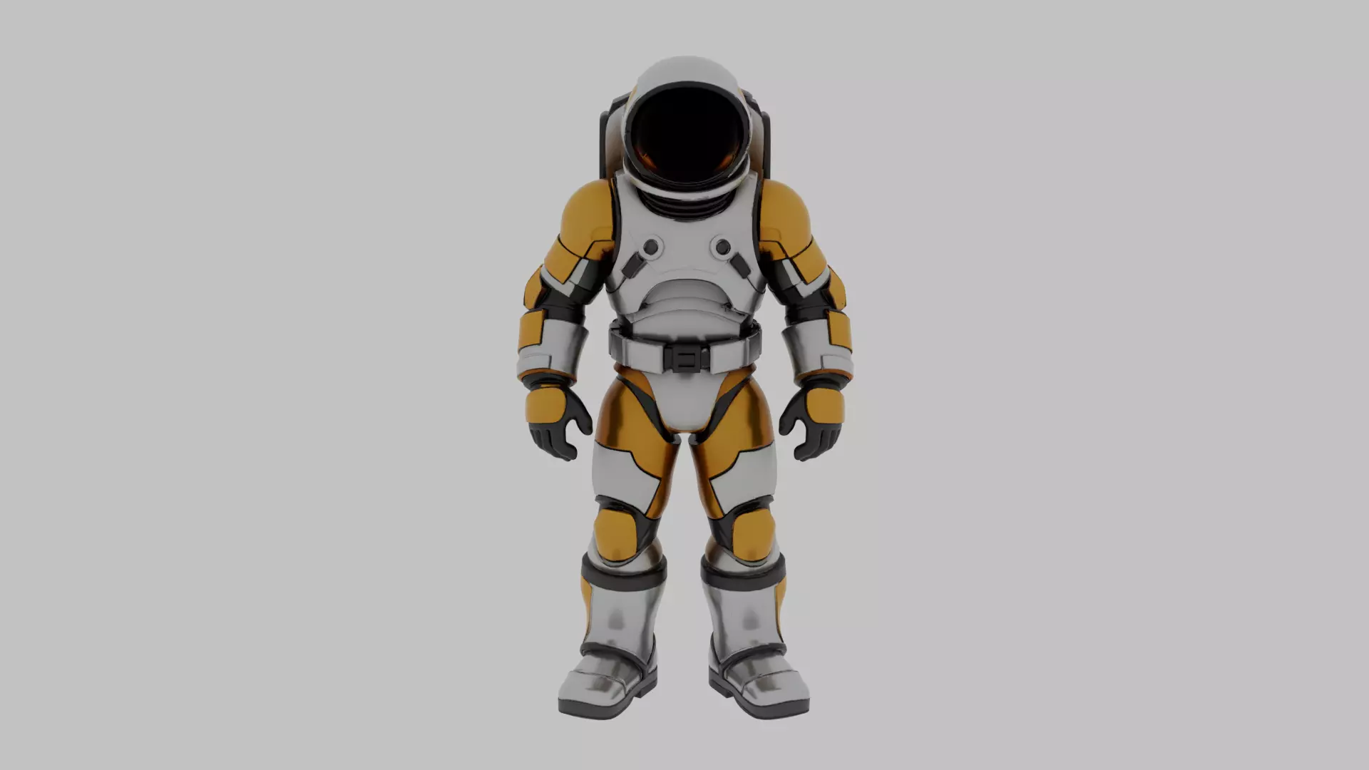 A high-detail 3D model of a futuristic Stellar Explorer suit. This advanced equipment features a sleek, streamlined design with high-tech components, engineered for deep space missions and presented on a clean white background.