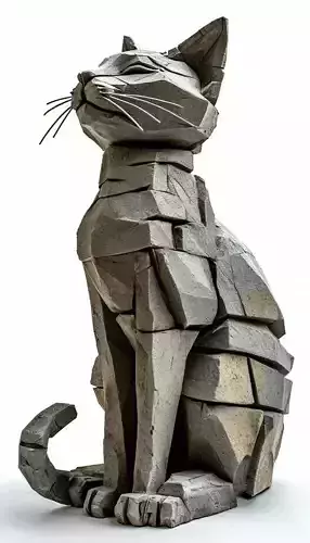Highly detailed 3D model of a stylized, low-poly cat sculpture crafted from textured stone or concrete, combining modern geometric design with the graceful form of a seated feline. The cat is depicted in a calm, upright pose, with its head slightly turned to the side, exuding an air of quiet dignity and alertness. Its body is composed of angular, faceted planes that mimic the appearance of carved stone blocks, creating a striking contrast between natural animal anatomy and abstract architectural geometry. Each polygonal surface features subtle variations in tone and texture, ranging from dark gray to light beige, simulating weathered rock or ancient masonry. Fine details such as sharp whiskers, pointed ears, and defined paw pads are carefully integrated into the minimalist aesthetic, preserving the essence of the cat while embracing a contemporary art style.