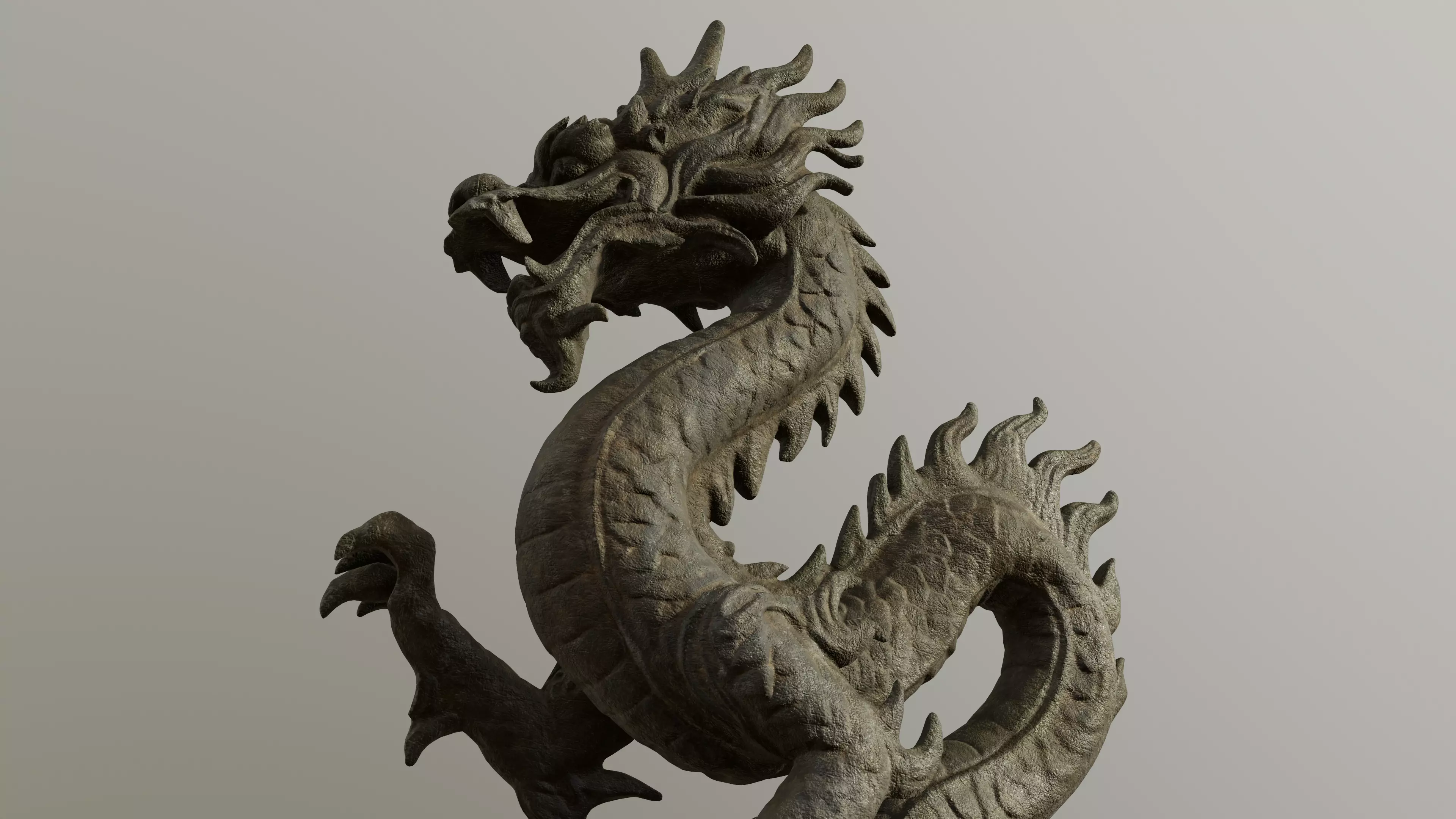 This 3D model features a striking stone dragon sculpture captured in a dynamic, upright pose with coiled body, extended claws, and an expressive, fierce head. The design includes sharply carved scales, flowing mane details, and a decorative cloud-like base, giving the statue strong mythological and architectural presence. The realistic stone texture—with cracks, erosion, and chiseled detail—makes this asset perfect for temples, fantasy worlds, ancient ruins, cultural environments, gardens, architectural scenes, and cinematic set dressing.