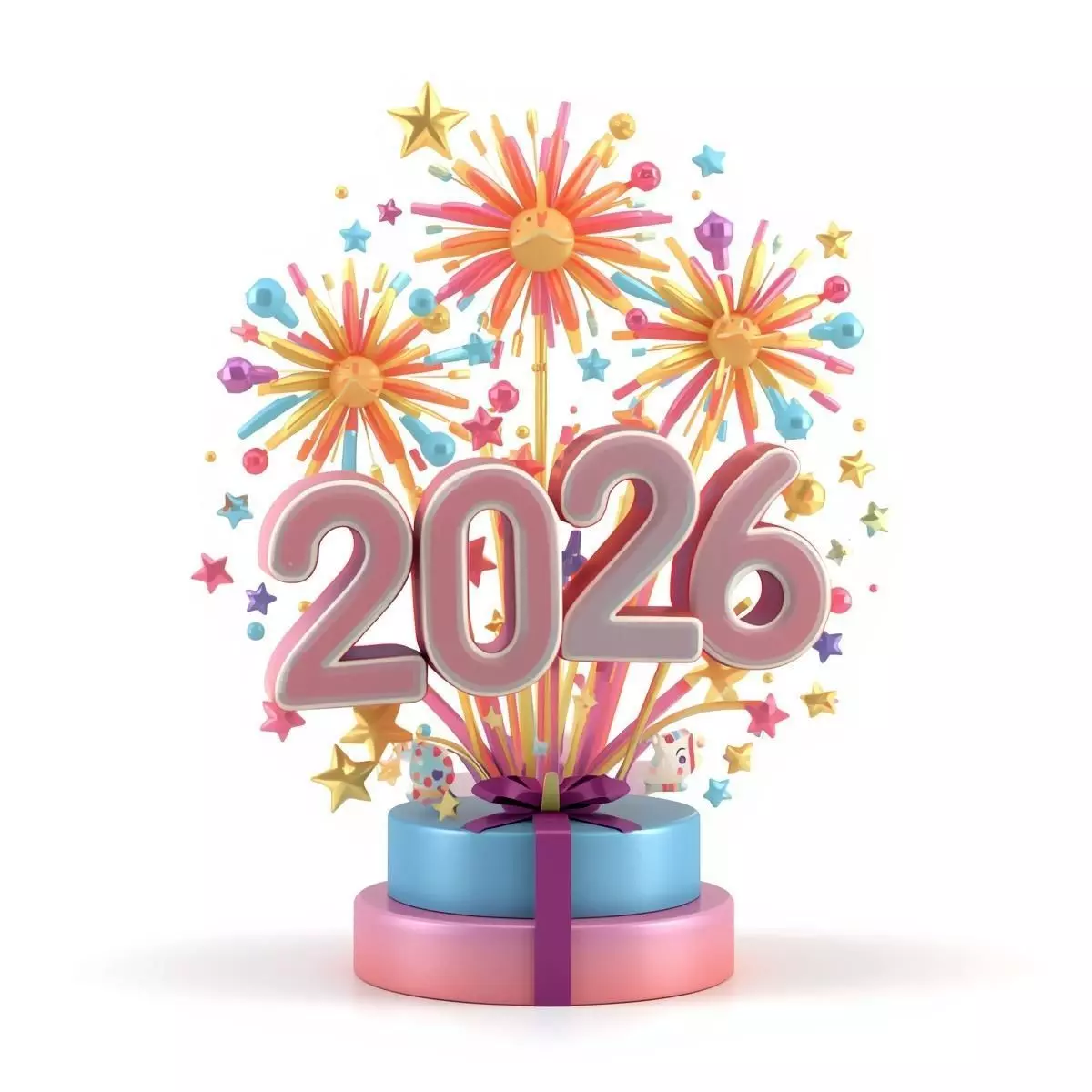 A high-quality 3D cartoon sculpture celebrating the arrival of 2026, featuring large festive numbers, burst-style fireworks, and scattered stars combined into a single centerpiece. Designed with smooth rounded geometry and a vibrant celebratory color palette, this asset is ideal for holiday-themed games, virtual events, or festive digital content. The model is presented as a full festive assembly isolated on a clean white background.