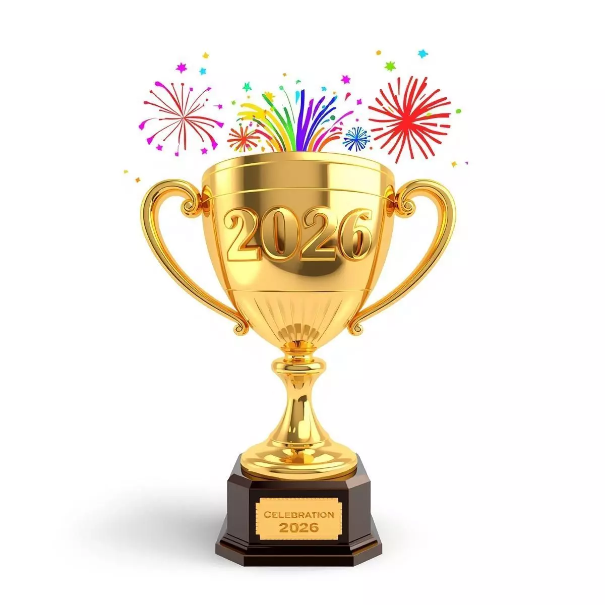 A premium, high-quality 3D cartoon-style trophy designed for New Year and 2026 milestone celebrations. The asset features a polished gold cup with a large 2026 engraved on the front, erupting with vibrant, colorful 2D-styled fireworks from the top. The trophy sits on a professional dark octagonal base adorned with a gold plaque reading CELEBRATION 2026. Isolated on a clean white background, this model is perfect for holiday-themed games, promotional graphics, or commemorative digital content.