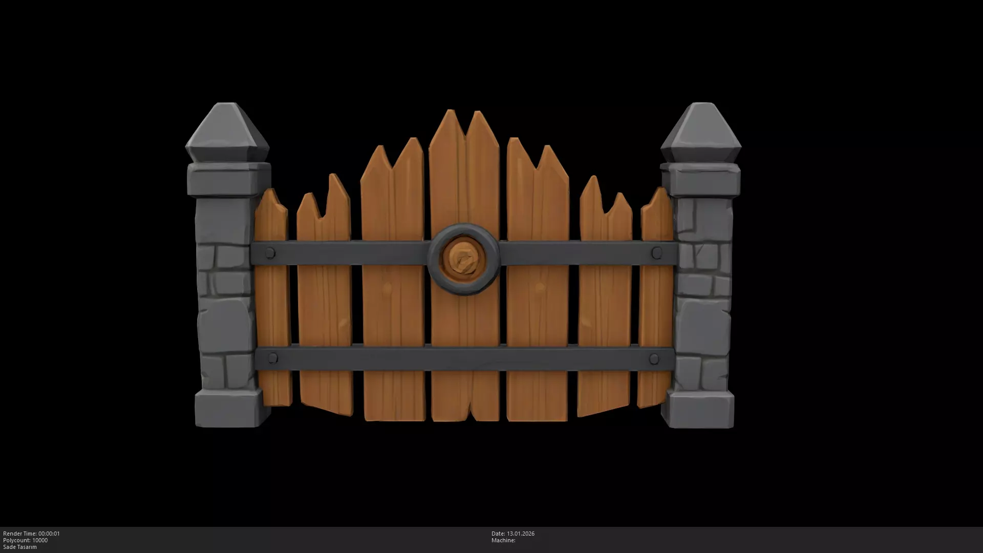 Stylized Wooden Fence / Medieval Garden GateThis is a high-quality, stylized 3D model of a rustic wooden fence. Featuring weathered wooden planks reinforced with iron bands and anchored by sturdy stone pillars, this model is perfect for medieval villages, farmhouse gardens, cottage exteriors, or as a modular barrier in RPG environments.