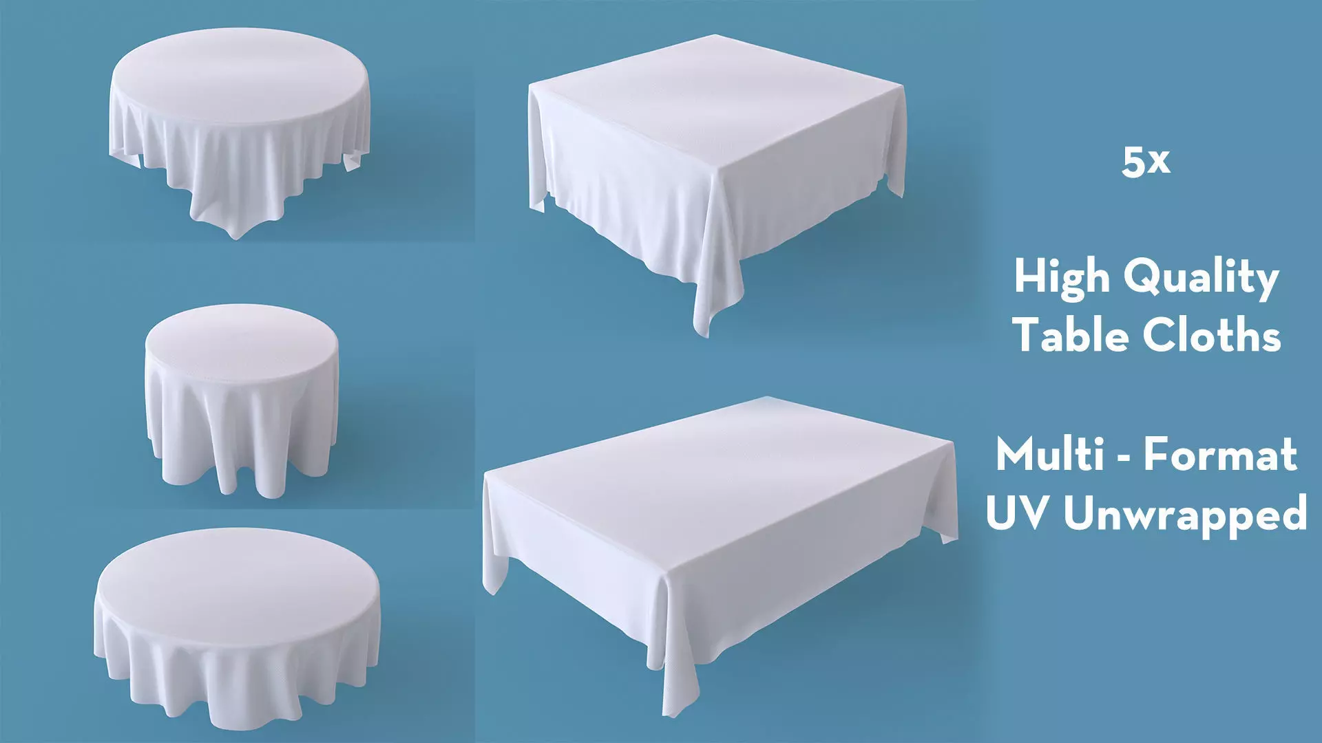 A Collection of Five simple tablecloths as OBJ, Max or Maya Files. A Simple Vray shader and lights are included with the Maya Scene.