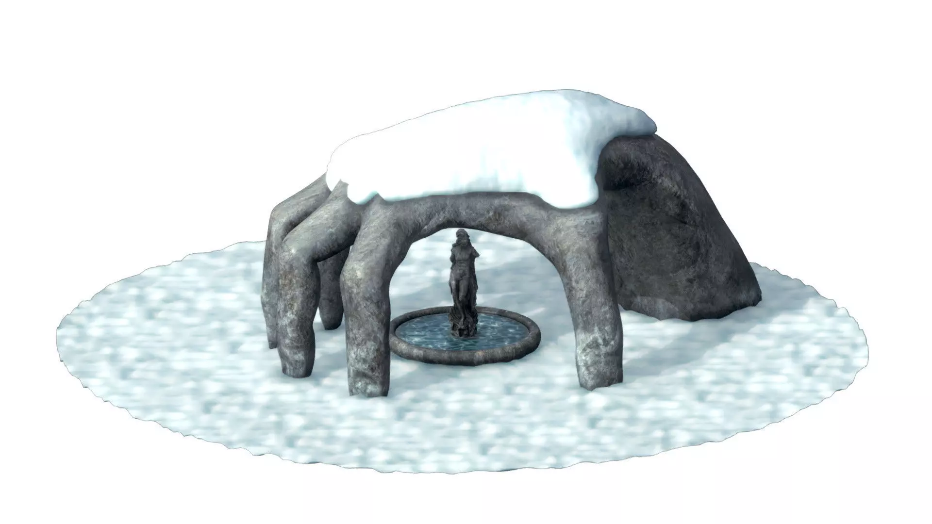 Objects like statue, fountain, ice, hand, snow, ground/floor are separate objects. Each with its own material.