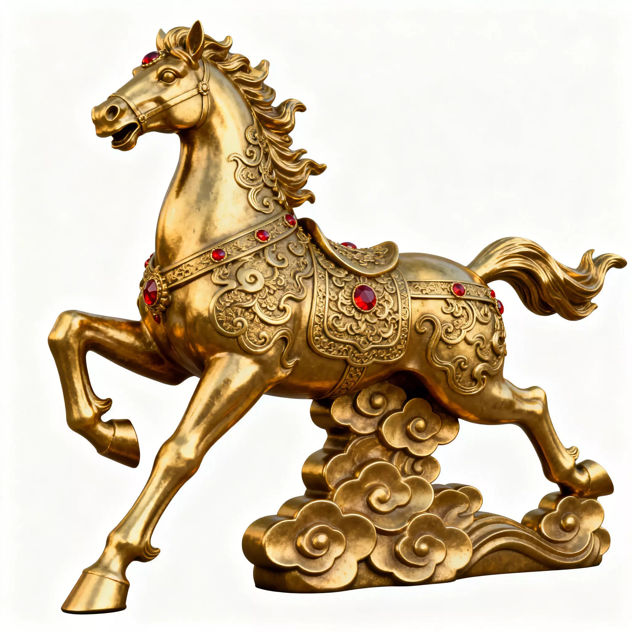 Traditional Filigree: The delicate carvings on the gold surface mimic high-end Chinese jewelry craftsmanship, turning the horse from a simple animal into an Imperial Treasure.Tagslunar new year 2026 year of the horse fire horse analysis golden horse statue prosperity symbol success mascot chinese zodiac fire element auspicious clouds ruby gemstones imperial gold 24k success arrival traditional ornamentation spring festival 2026