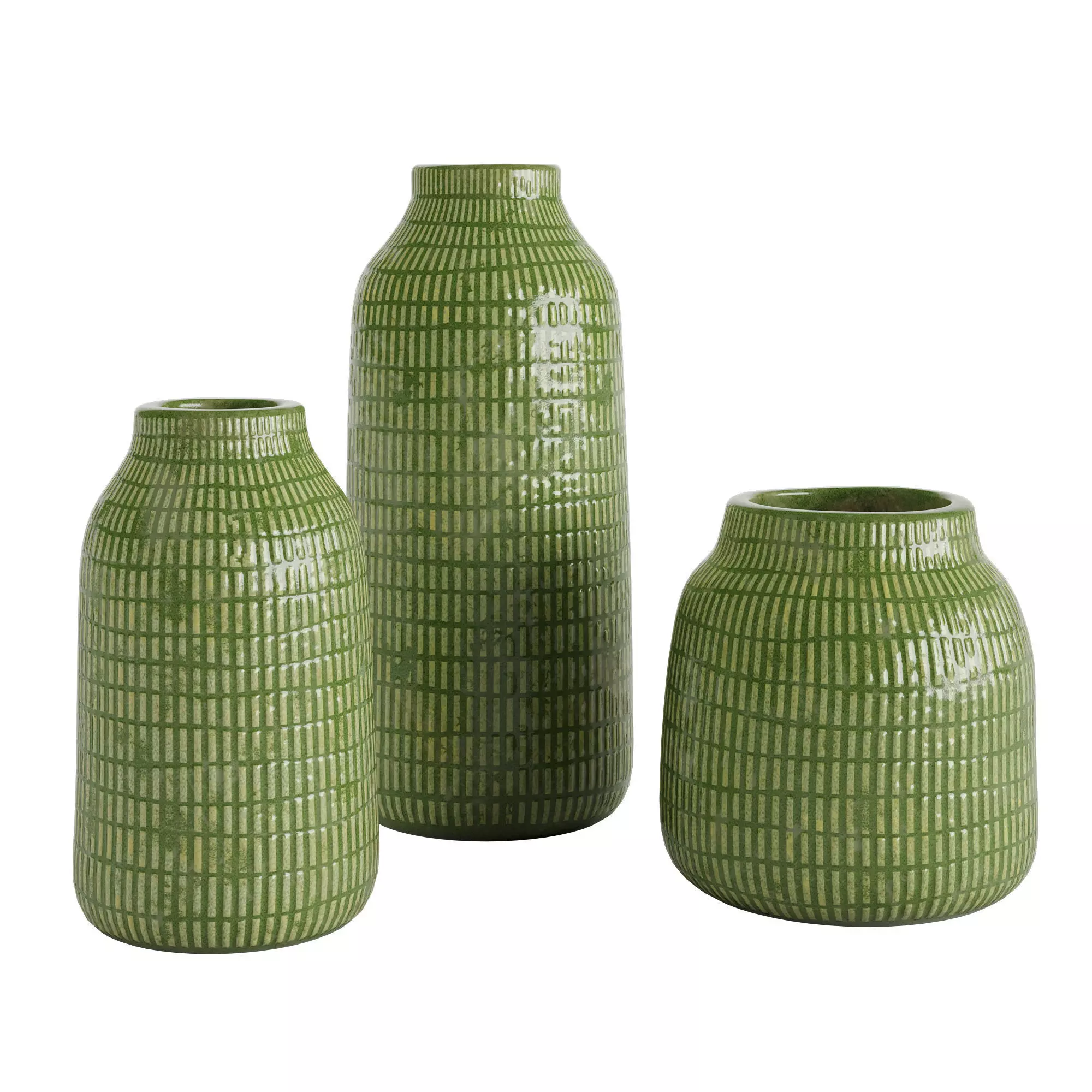 Three Green vasesThese three handcrafted, glazed green vases, featuring embossed patterns and vibrant colors, would be a delightful addition to any interior space.Type: modelFormat: 3Ds Max 2021Export: FBX, OBJ, 3DSRender: Corona (10,)Polys: 12528Verts: 12534Matclasses: _CoronaPhysicalMtlUnits: CentimetersDimension: 44.7 x 34.17 x 34.46