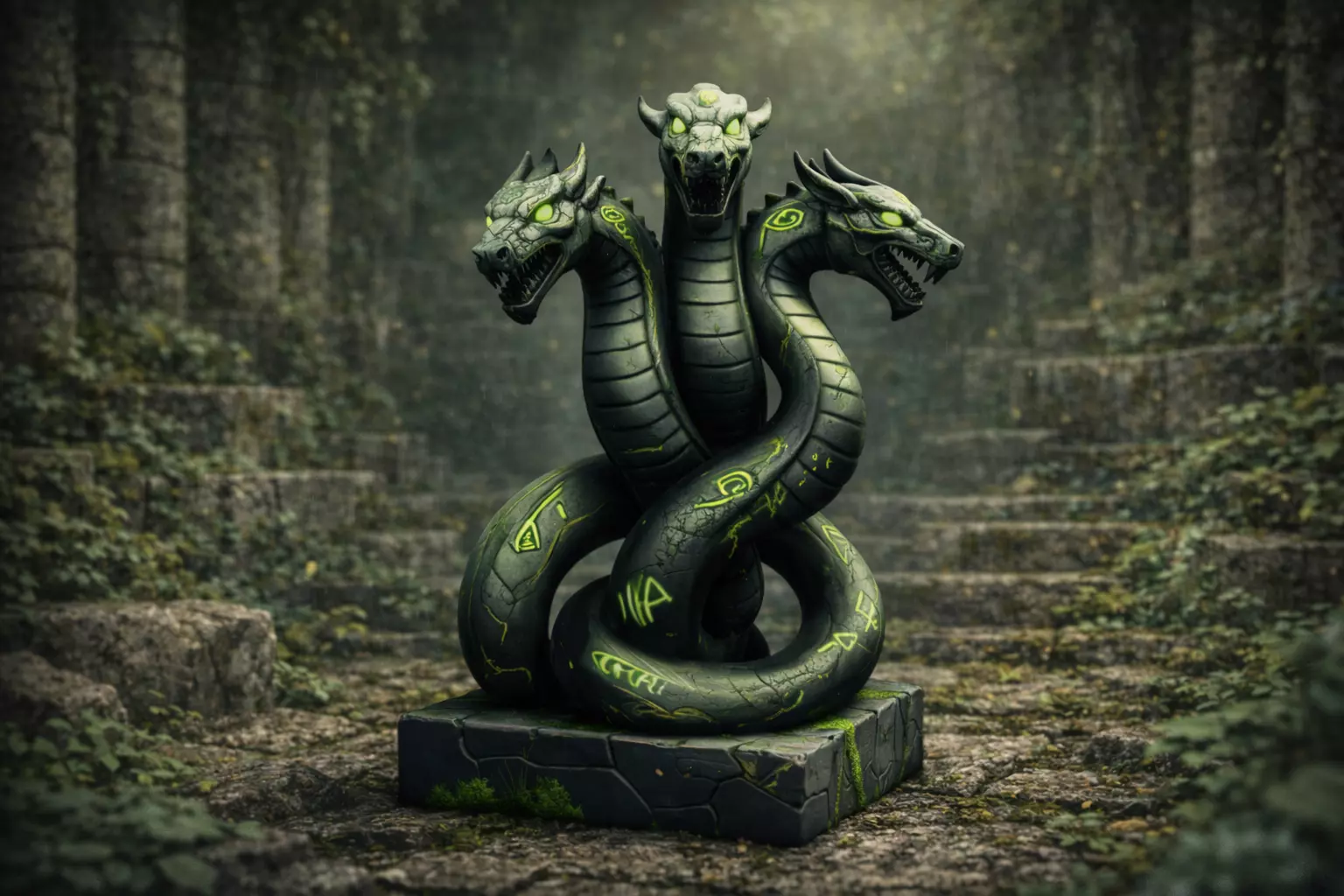 Three-Headed Hydra Guardian Statue – Stylized Fantasy 3D ModelThis Three-Headed Hydra Guardian Statue is a high-quality stylized fantasy 3D model created in Blender. The hydra features three serpentine heads, coiled bodies, and a powerful guardian pose, carved as an ancient stone monument. Glowing green runes and magical symbols are engraved across the stone surface, suggesting forbidden magic and ancient power sealed within the statue.Resting on a stone base with subtle moss and weathering, this asset feels old, mystical, and dangerous—perfect for fantasy RPG environments, dark temples, ruins, dungeons, and cinematic scenes. The stylized anatomy and clean shapes ensure excellent readability while maintaining rich sculpted details.This model works perfectly as an environment centerpiece, guardian statue, boss monument, or mythical shrine prop in stylized games and renders.