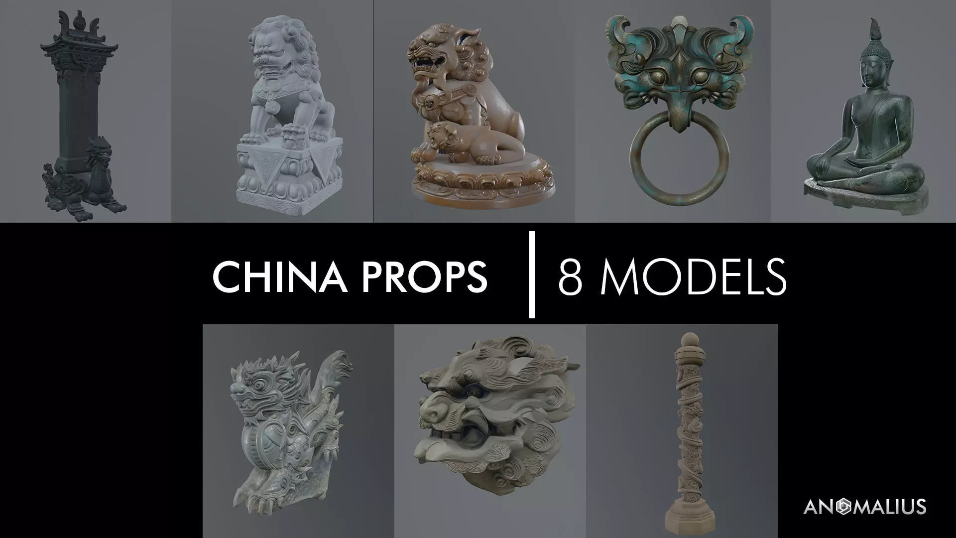 Set of 8 traditional Chinese decorative props featuring guardian lions, Buddha statue, ritual columns, ornamental masks, and architectural carvings. Designed for temples, shrines, historical scenes, and cultural environments. Low–mid detail, game-ready assets suitable for real-time use.