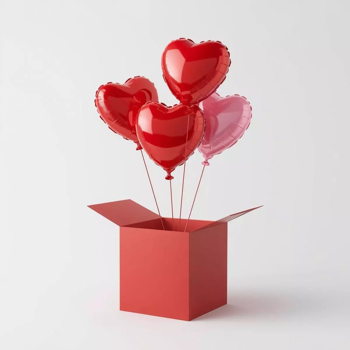 Features a collection of vibrant red and soft pink heart-shaped balloons emerging from a slightly open gift box.
