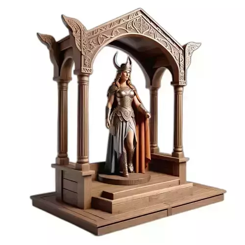 Presenting a meticulously crafted 3D model of a powerful female warrior or goddess, reminiscent of a Valkyrie, proudly displayed within an exquisitely ornate wooden shrine. This high-detail asset features a formidable figure adorned in intricately designed armor, complete with a distinctive horned helmet and a flowing cape, exuding an aura of ancient mythology and fantasy. The accompanying wooden shrine is a masterpiece of digital craftsmanship, showcasing highly detailed carvings, robust columns, and an archway with elaborate patterns, making it a focal point in any scene. This versatile model is ideal for a myriad of applications, including immersive game development as a grand monument or interactive prop, stunning architectural visualizations set in fantasy realms or historical interpretations, and compelling digital art compositions. It is also perfectly suited for augmented reality (AR) experiences, bringing a touch of epic fantasy to virtual environments. Furthermore, its clean topology and high detail make it an excellent candidate for high-quality 3D printing, allowing for the creation of a tangible collectible or decorative item. The model is prepared for high-fidelity rendering, featuring PBR textures for realistic material representation and is fully UV unwrapped for easy customization. Supported file formats include GLB, OBJ, STL, ABC, DAE, FBX, USD, and PLY, ensuring broad compatibility across various 3D software and engines. While optimized for static renders, it can also be adapted for real-time applications with appropriate poly-count optimization, offering flexibility for different project needs.