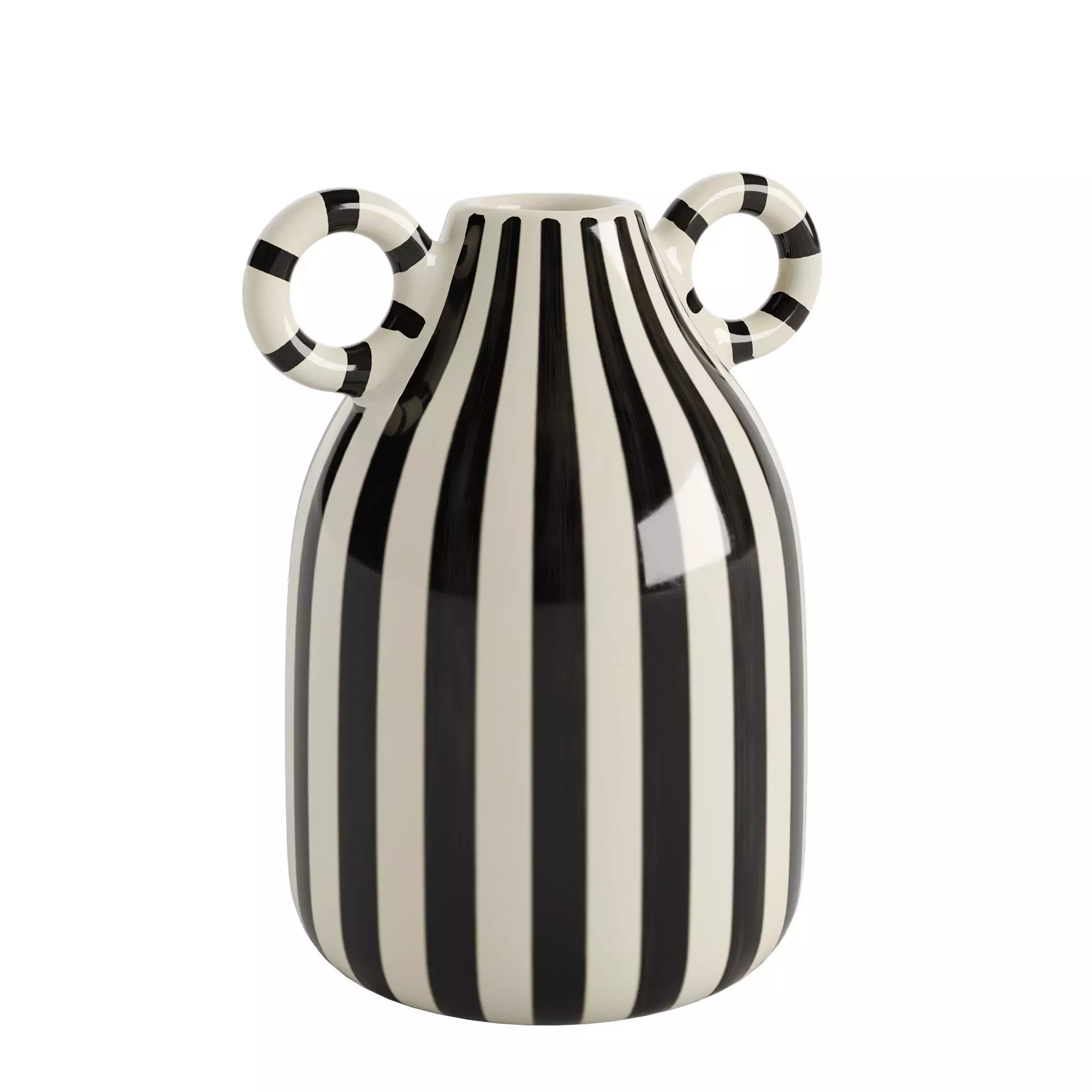• Add a bold accent to your interior with this striped vase featuring a playful black and white design. The rounded shape and circular handles create a sculptural silhouette that draws the eye, while the multi-coloured striped pattern adds a contemporary edge