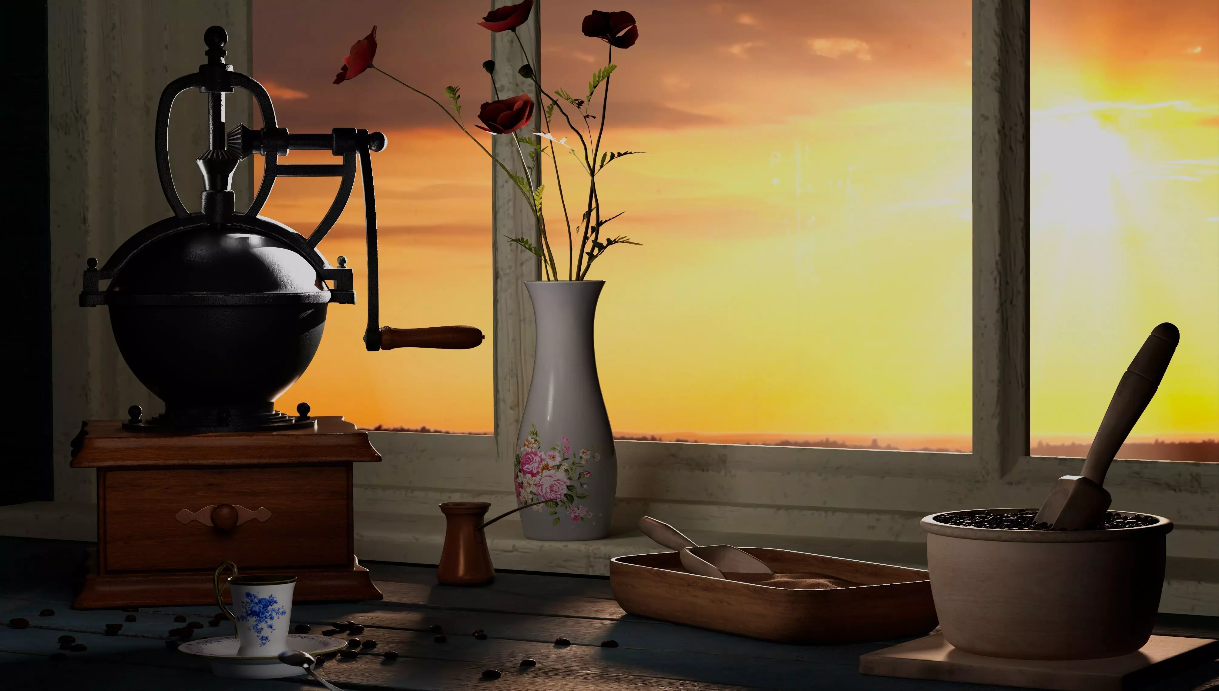 The rendering is composed of a vintage cast-iron coffee grinder and coffee mug, cup and saucer with a tea spoon, trays with ground coffee and coffee beans, and a porcelaneous vase.Update your virtual home with classic pieces that feel timeless. Vintage meets antiquarian styling with scratches on cast-iron coffee grinder and classical taste porcelain ware. This 3D model has a fully textured, detailed design that allows for close-up renders. Every model has been checked with the appropriate software.Important notice: camera and light setting include only for primary view.*IMPORTANT NOTICE: PLEASE MAKE SURE THAT YOU'VE GOT THE LATEST VERSION OF ARCHIVING SOFTWARE.Note: The product comes without scene, camera or lights, including only 3D model. Camera and lights setting include only for primary view in koffemachine.mb .texture set including :/ arnold/ vray/pbr. Subdivision ready.