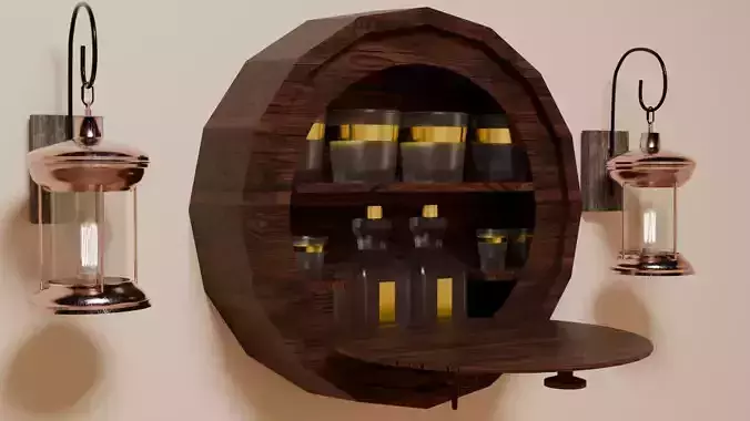 This vintage keg-shaped wall bar combines rustic charm with practical design. Modeled with sixteen sides for a smooth barrel-like form, it mounts directly to the wall and features a front door that opens downward to reveal a neatly arranged interior. Inside, glassware and decanters are displayed, creating a classic home bar aesthetic reminiscent of old pub decor. The exterior includes a faux wooden spigot for added authenticity and handcrafted detailing. The model comes in two versions: a fully detailed version with visible glassware, and a closed, low-poly alternative for optimized performance in real-time or game environments. Perfect for vintage, rustic, or industrial-themed interiors, this piece blends craftsmanship and functionality in a striking wall-mounted design.