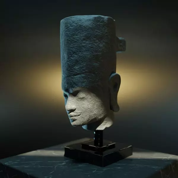 Head of Vishnu in grey sandstone crowned by a high cylindrical mitre called kiritamukuta. The serene face has a wide forehead and almond-shaped eyes revealing the pupils. The ears with the typical wide pendants and the fleshy lips highlighted by a thin moustache are part of the pre-Angkorian style. The mitre, which shows a soberness characteristic of the Phnom Da style of Vishnus of the 6th to 8thcenturies, sits on the temples in the form of a bracket. The earlobes present a rectilinear depression for receiving, as was the custom in the pre-Angkorian statuary, encrusted with gold or precious stones. On the neck, incised lines symbolize beauty.