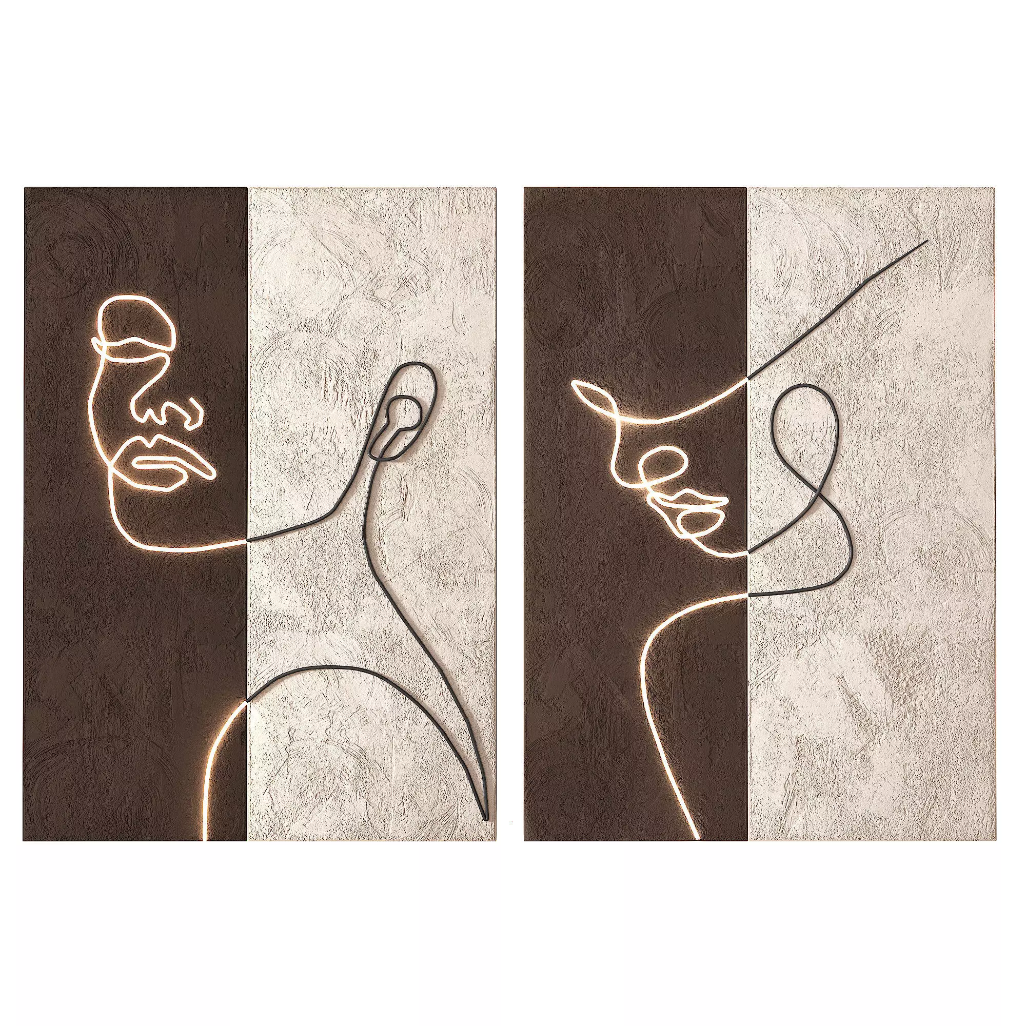 A stylish set of 3D modern LED wall art pieces featuring minimalist face line drawings integrated with subtle lighting elements. Designed with a balance of contrast and elegance, each panel showcases abstract facial outlines using glowing LED curves against textured plaster surfaces. The combination of light and texture creates a striking focal point, ideal for contemporary interiors.