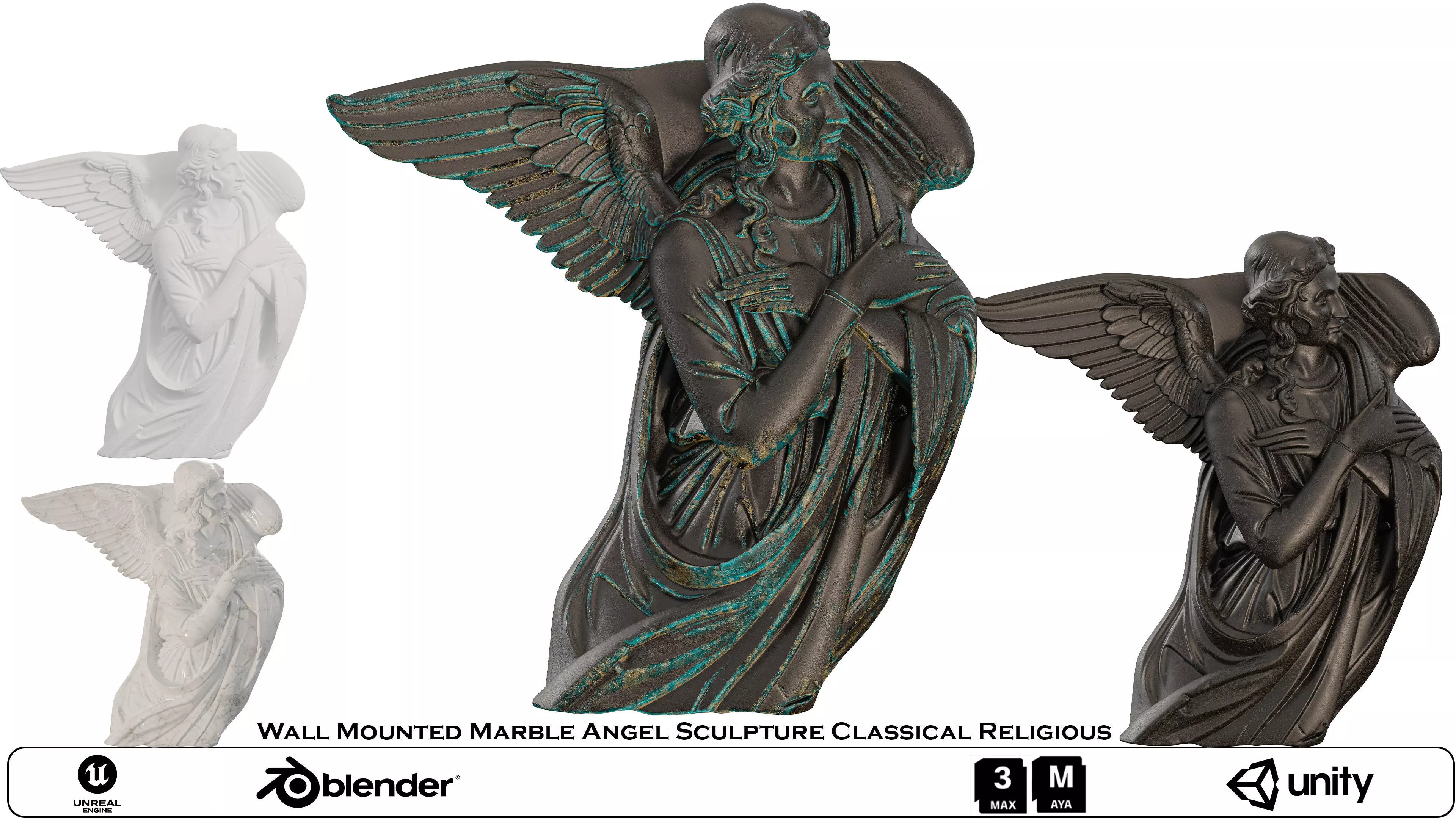 Name: Wall Mounted Marble Angel Sculpture Classical ReligiousType: modelFormat: 3Ds Max 2013Export: FBX, OBJRender: VRay (5.x), Corona (6)Polys: 151528Verts: 76444Matclasses: VRayMtl,CoronaMtlUnits: CentimetersDimension: 92.61 x 28.3 x 102.3Date: 2025.11.13