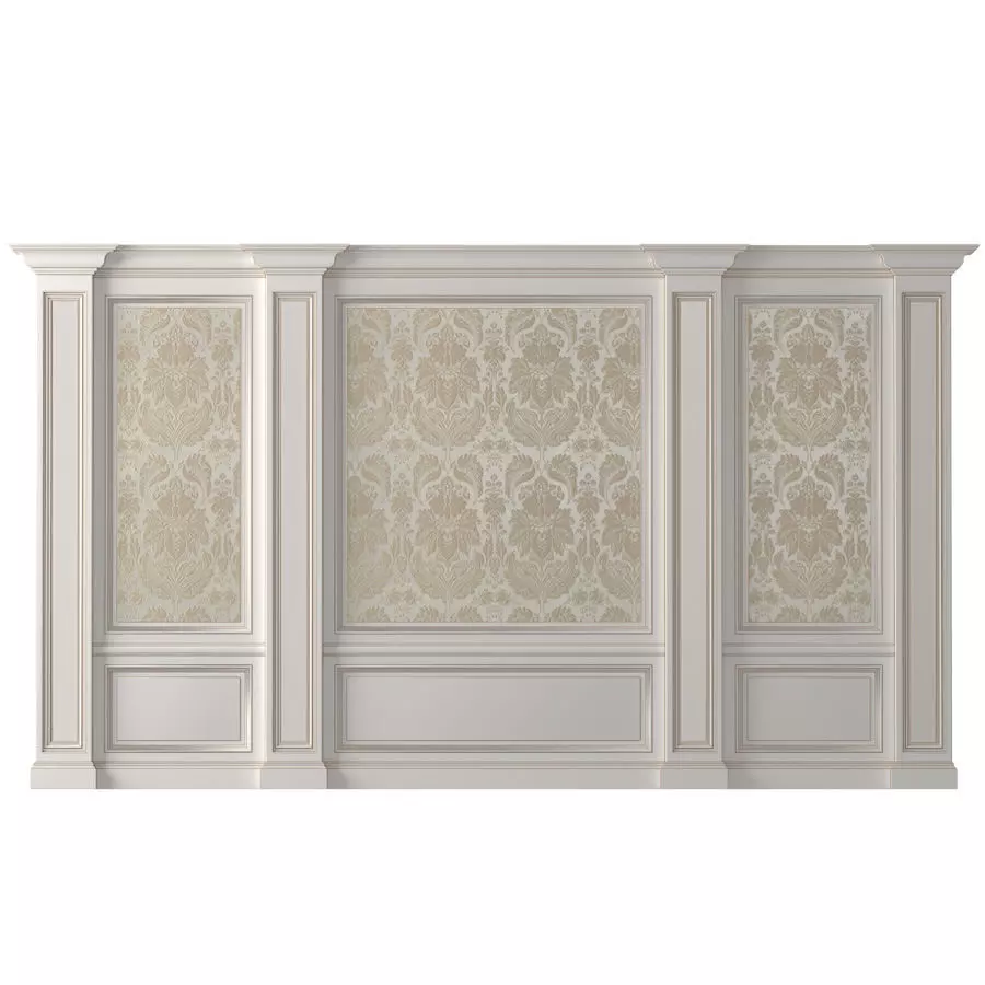 Classic gypsum (wood) wall panel with gilded capitals and classic textile wallpaper (tapestry) with the effect of a velvety mother-of-pearl surface.
