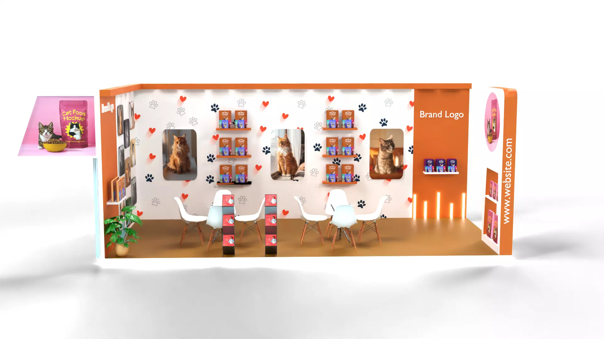 Rendered using Blender 4.3, this booth is tailored for a pet food brand, blending warmth and charm with real-world scale and functionality. The white-and-orange themed layout features playful cat paw and heart motifs, enhancing its emotional and engaging appeal. Bloom effects subtly illuminate the product shelves and wall cutouts showcasing life-sized cat images. Display shelves are symmetrically placed with actual product mockups, and the side panel integrates branding with vertical product displays. Realistic textures and image banners give the entire structure a cozy, store-like finish.