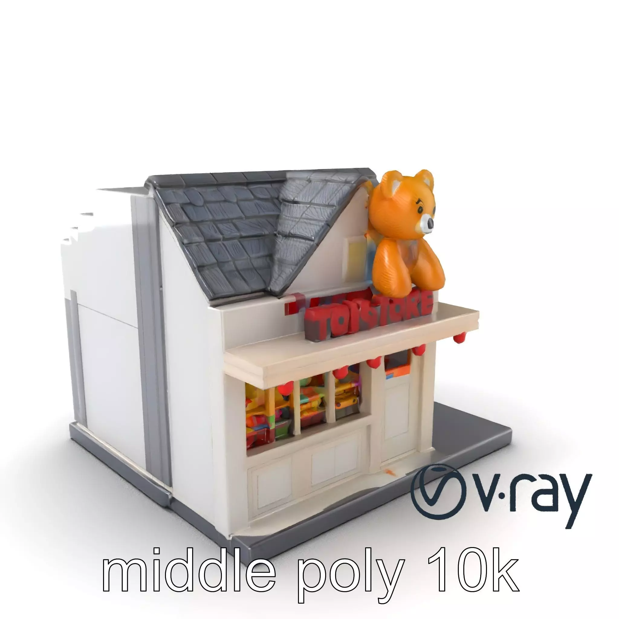 This whimsical toy store model features a giant teddy bear sign, colorful windows, and a playful vibe, making it perfect for children's or festive designs. Ideal for creating vibrant scenes in animations, games, or architectural visualizations.