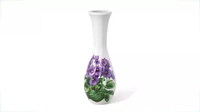 This elegant white ceramic vase features a slim, elongated silhouette adorned with violet flowers in full bloom. The floral pattern wraps delicately around the curved surface, creating a soft, romantic visual.Crafted for both beauty and simplicity, this piece suits a variety of scenes including modern interiors, cozy home décor settings, or as a refined asset in product showcase and floral-themed renders.