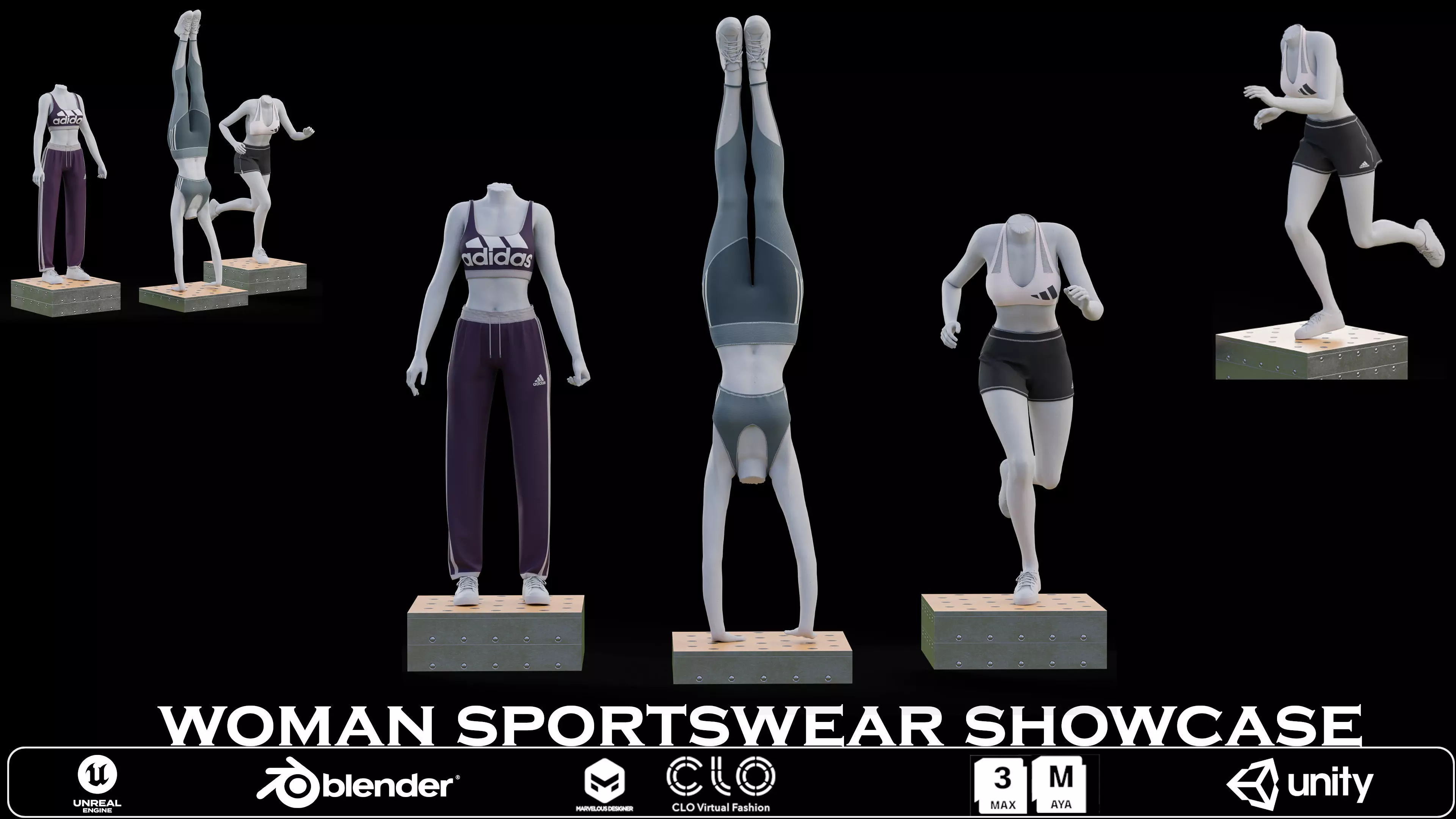 This high-quality 3D model set showcases dynamic poses of female mannequins dressed in modern sportswear, ideal for fashion visualizations, product presentations, animation scenes, and game environments.