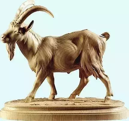 Download the exquisite 3D model of a wooden goat sculpture, a detailed digital recreation of a hand-carved animal figure crafted from natural wood, showcasing fine craftsmanship and lifelike realism. This wooden goat 3D model features a majestic mountain goat in mid-stride, with long, curved horns, a flowing beard, and textured fur rendered with intricate grain patterns and subtle shading. The sculpture is mounted on a circular wooden base, enhancing its display quality and stability. Ideal for use in interior design, art exhibitions, NFT collectibles, concept art, educational content, and digital storytelling, this goat statue 3D asset brings rustic charm, natural beauty, and artistic depth to any project.