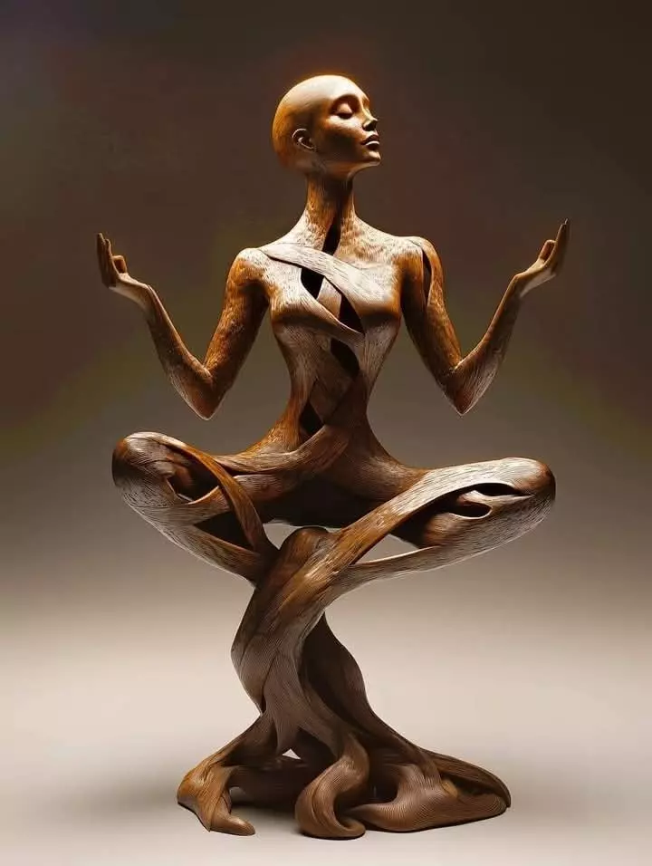 The pose is dynamic yet tranquil—a seated lotus position with legs crossed and arms extended outward, palms open in a gesture of openness or release. The head is tilted back, eyes closed, and expression serene, evoking a sense of inner peace and spiritual connection. The body is stylized with exaggerated curves and flowing lines that suggest movement and energy, while the base is sculpted into a swirling, root-like form that grounds the figure in nature.