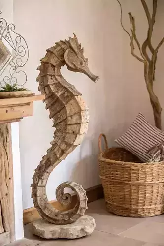 Download the exquisite 3D model of a wooden seahorse sculpture, a digital recreation of a handcrafted, coastal art piece designed to bring natural beauty and rustic charm to any interior space. This seahorse 3D model features a tall, curved body sculpted from rich, warm-toned wood — meticulously modeled to mimic real grain patterns, knots, and natural wear that reflect its artisanal origin. The form is defined by layered, overlapping plates along its back and tail, each carved with subtle ridges and edges that enhance its organic, textured quality. Its head is detailed with a small, pointed snout and delicate eye, while the iconic curled tail spirals elegantly downward, resting on a simple, rough-hewn stone base that grounds the piece with stability and earthy realism.